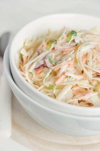 Описание: Капустный салатИнгредиенты:- 1/2 белокочаннойкапусты- 1 большая морковь- 2 пера зеленого лука- 1 маленькая краснаялуковицаДля заправки:- 1 1/2 ст.л. сахара- 1/4 ч.л. соли- щепотка перца- 1 столовую ложкумолока- 2 столовых ложкисметаны- 2 столовые ложкикефира- 1,5 чайной ложкидижонской горчицы- 1 ст.л. лимонного сока- 2 чайные ложкисушеной петрушки илисвежейСпособ приготовления:1) Капусту тонконашинковать2) Морковь натереть натерке3) Лук тонко нарезать наполукольца или начетвертинки4) Зеленый лук мелкопорубить5) Смешать все овощи всалатнице6) В отдельной мискесмешать сахар, соль,горчицу, молок и кефир- тщательноперемешать венчиком,добавить сметану-перемешать, добавитьлимонный сок-перемешать, присыпатьпетрушкой7) Вылить заправку всалат и перемешать8) Поставить вхолодильник на 15минут и подаватьПриятного аппетита