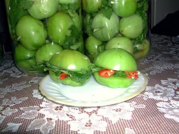 Описание: ИнгредиентыТомат (помидор) зеленый- 2 килограммаСельдерей- 100 граммовЧеснок- 10 зубчиковПерец горький стручковый- 3 штукиСоль- 70 граммовВода- 1 лПриготовление1. Разрежем помидорки вдоль, но немного не до конца.2. Порежем на пластинки чеснок, ва перчик колечками. Сельдерей разберем на веточки.3. Теперь в серединку помидоров положим понемногу всех подготовленных компонентов.4. Чтобы помидоры не развалились, закрепим их обычными нитками.5. Подготовим кастрюльку и на ее дно выложим слой из веточек сельдерея. Далее начиненные помидорки и сверху опять сельдерей.6. Соль разводим в воде и поливаем помидоры.7. Ставим сверху гнет.8. Зеленые помидоры соленые будут готовы, когда рассол станет прозрачным и перестанет пузыриться.Зеленые помидоры соленые можно кушать как закуску или залить кипящим рассолом и закатать на зиму.Приятного аппетита!