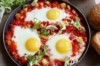 Описание: Только вкусный, сытный ияркий завтрак поможет нам быть бодрыми по утрам. Именно такойзавтрак мы вам и предлагаемприготовить. В этой глазуньеесть все: сытная картошка,сладкий перец, сочныепомидоры и освежающаязелень! Пусть утро начинаетсявкусно!Количество порций: 4 шт.Время приготовления: 25минутИнгредиенты:- Яйца куриные 4 шт.- Картофель 1 шт./150 г- Болгарский перец красный 1 шт./200 г- Помидоры 2 шт./150 г- Томатная паста 1 ст. л./20 г- Хмели-сунели 1/4 ч. л.- Черный перец молотый 1/8 ч. л.- Зелень (петрушка, базилик,руккола)- Оливковое масло- СольПриготовление:1. Картофель почистить,болгарский перец помыть,очистить от основания исемян, помидоры помыть.Нарезать овощиодинаковыми маленькимикубиками. В сковородуналить столовую ложкуоливкового масла, поставитьна средний огонь, добавитькартофель. Готовить,периодически размешивая,около 5 минут.2. Добавить болгарский переци помидоры, готовить еще 3минуты. Посыпать овощиспециями на свой вкус(хмели-сунели, сушеныйбазилик, черный молотыйперец, измельченный чеснок),добавить томатную пасту,соль и размешать.3. Сделать в овощах четыреуглубления и аккуратно влитьв них по яйцу (стараясь неповредить желток).Уменьшить огонь доминимума, посыпать яйцасолью и жарить их доготовности. Подавать сизмельченной зеленью.Приятного аппетита!