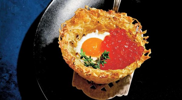 Описание: Закуска на 4 порции. Легко приготовить и в будние дни, и на праздничный стол.📌 Нужно:🔹 300 г картофеля🔹 100 г красной икры🔹 30 г тертого пармезана🔹 4 перепелиных яйца🔹 свежемолотый чёрный перец🔹 зелень для подачи🔹 соль📌 Готовка:🔷 Натрите картофель на тёрке, отожмите, смешайте с пармезаном, солью и перцем. 🔷 Разложите массу по формочкам для маффинов и запекайте в духовке при 180 °С 20 мин. 🔷 В каждую корзиночку разбейте по перепелиному яйцу и запекайте ещё 5-7 мин.