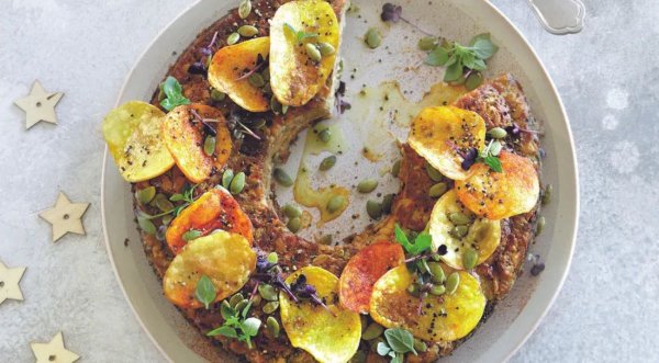 Описание: Второе блюдо. В остывшем виде может подаваться в качестве закуски. Для праздничного стола.📌 Нужно (на 6 порций):🔹 500 г шампиньонов🔹 400 г сушёных грибов🔹 150 г перловой крупы🔹 100 г корня сельдерея🔹 100 г фундука🔹 50 г тёртого сыра🔹 4 ст. л. растительного масла + немного для формы🔹 3 зубчика чеснока🔹 1 кубик овощного бульона🔹 1 средняя луковица🔹 небольшой пучок петрушки🔹 веточка розмарина🔹 щепотка соли🔹 щепотка молотого мускатного ореха🔹 3 ст. л. тыквенных семечек🔹 горсть картофельных чипсов📌 Готовка:🔷 Разведите овощной бульонный кубик в воде, отварите с ним перловую крупу. Оставьте 4 ст. л. отвара, остальной слейте и промойте перловку.🔷 Отдельно отварите сельдерей до мягкости. Готовый сельдерей разомните вилкой и смешайте с перловкой.🔷 Замочите сушёные грибы на 15 мин. Почистите лук, мелко порежьте. Измельчите чеснок. Порежьте замоченные грибы и шампиньоны ломтиками. Подогрейте сковороду с растительным маслом, обжарьте лук и чеснок, затем всыпьте грибы, положите розмарин и обжаривайте 7-10 мин. Переложите в миску, остудите.🔷 Измельчите фундук. Мелко порубите петрушку. В миску с грибами, чесноком и луком положите перловку с сельдереем, посыпьте тёртым сыром, фундуком, петрушкой, молотым мускатным орехом и солью, тщательно перемешайте и поставьте в холодильник на 24 ч.🔷 Разогрейте духовку до 200 °C. Достаньте массу из холодильника. Смажьте круглую форму для выпечки с отверстием растительным маслом, переложите в неё массу и накройте фольгой. Запекайте в течение 1 ч, готовность проверьте деревянной шпажкой. Выньте форму из духовки, слегка остудите, накройте тарелкой и аккуратно переверните. Посыпьте венок тыквенными семечками, подавайте с картофельными чипсами.