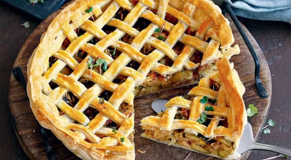 Описание: Просто и изысканно. Этот пирог никого не оставит равнодушным, а главное, он очень просто готовится.📌 НУЖНО (на 4 порции):🔹 500 г слоёного бездрожжевого теста🔹 180 г сыра пармезан🔹 50 г бекона или варёно-копчёной грудинки🔹 1 маленькое яйцо🔹 360 г брюссельской капусты🔹 2-3 большие луковицы🔹 5 зубчиков чеснока🔹 молотый чёрный перец, соль – по вкусу📌 ГОТОВКА:🔷 Разморозьте тесто.🔷 Бекон нарежьте кусочками, положите на холодную сковороду, поставьте на умеренный огонь и дождитесь, когда вытопится жир.🔷 Нарежьте лук тонкими полукольцами. Чеснок измельчите. Брюссельскую капусту тонко нашинкуйте.🔷 Переложите лук в сковороду к бекону, слегка посолите и готовьте, изредка помешивая, до золотисто-коричневого цвета, 15-20 мин. Добавьте чеснок, готовьте 2 мин.🔷 Добавьте в сковороду капусту, перемешайте и готовьте до мягкости, 8-10 мин. Переложите в миску и остудите до комнатной температуры. Поперчите и вмешайте натёртый на крупной тёрке сыр.🔷 Половину теста нарежьте полосками шириной около 1 см. На листе бумаги для выпечки сформируйте из полосок теста решётку диаметром на 1 см. больше диаметра формы. Прикройте плёнкой, уберите в холодильник.🔷 Разогрейте духовку до 220 °C. Слегка раскатайте оставшееся тесто в круг и выложите в круглую форму с высокими бортиками (тесто должно быть чуть выше бортиков). Выложите начинку и обрежьте излишки теста, оставляя 1 см. над начинкой.🔷 Смажьте свободные края слегка взбитым яйцом. Положите на начинку решётку из теста, защипните край. Смажьте яйцом, стараясь, чтобы оно не стекало на срезы теста.🔷 Поставьте пирог в духовку, убавьте температуру до 200 °C и выпекайте пирог 30 мин., до золотистого цвета.