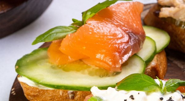 Описание: Что такое тапас с солёной рыбой и творожным сыром по-нашему? Это мини-бутерброд всё с той же солёной рыбой и сыром на кусочке хлеба. И да, практически любого. Можно взять багет с хрустящей корочкой и ноздреватым мякишем, можно - цельнозерновой или ржаной хлеб. Что это меняет? Во-первых вкус, а во-вторых качество и пользу для организма. Сами понимаете, что в цельнозерновом хлебе пользы будет больше. А то что рыба прекрасно гармонирует с творожным сыром, особенно, если она достаточно солёная, можете не сомневаться - в такой паре её вкус будет гораздо деликатнее. Но нам ничего не мешает пойти по пути дальнейшего усовершенствования тапаса с солёной рыбой. Например, добавить к сыру мелко порубленного свежего укропа или копчёной паприки. У вас получатся две совершенно разные закуски. Смело пробуйте и другие вариации, со специями или зеленью. Проявите больше фантазии и тогда разнообразие тапасов станет главной идеей для фуршетной вечеринки. Гости точно будут вам благодарны и, скорее всего, уйдут домой, вдохновлённые вашим кулинарным творчеством.📌 НУЖНО (на 2 порции):🔹 100 г слабосолёной форели или сёмги🔹 100 г творожного сыра🔹 2 маринованных огурца🔹 2 веточки зелёного базилика📌 ГОТОВКА:🔷 Нарежьте рыбу и маринованные огурцы тонкими ломтиками. 🔷 Намажьте багет творожным сыром, разложите рыбу и огурцы. 🔷 Украсьте листочками базилика.