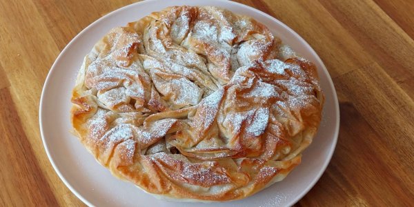 Описание: ✅ Воздушный яблочный пирог «Вуаль невесты»📌 НУЖНО (на 6 порций):🔹 Яблоки – 4–6 штуки🔹 Сахар – 120 г🔹 Лимон – ½ штуки🔹 Арманьяк, коньяк или кальвадос – 60 мл🔹 Сливочное масло – 75 г🔹 Тесто фило – 12 листов🔹 Сахарная пудра – для украшения📌 ГОТОВКА:🔷 Очистите яблоки и нарежьте тонкими дольками. Смешайте с 40 г сахара, лимонным соком и алкоголем. Оставьте на час.🔷 Разогрейте духовку до 180 ℃. Растопите масло и смажьте круглую форму, диаметром 25 см.🔷 Выложите один лист фило в форму и смажьте маслом. Прижмите края к бокам формы, оставьте их свисать.🔷 Положите ещё четыре листа теста, смазанного маслом. Располагайте их под разным углом.🔷 Выложите на тесто яблочную начинку, разровняйте.🔷 Смажьте маслом новый лист теста, присыпьте сахаром и сомните. Положите на яблоки. Точно так же подготовьте остальные листы и выложите на начинку. Подверните края.🔷 Выпекайте пирог 30–35 минут. Подавайте тёплым или остывшим, посыпав сахарной пудрой.