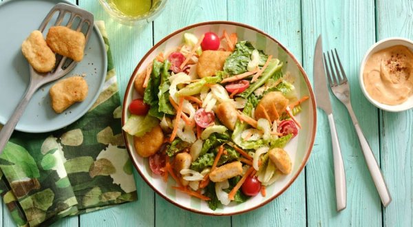 Описание: ✅ Салат с наггетсами в медово-горчичной заправке📌 НУЖНО (на 4 порции):🔹 300 г готовых наггетсов🔹 1 кочан салата Романо🔹 250 г помидоров черри🔹 3 стебля сельдерея🔹 1 морковь🔹 1 ст. л. растительного масла🔻🔻🔻 Для соуса:🔹 5 ст. л. майонеза🔹 3 ст. л. соуса барбекю🔹 2 ст. л. лимонного сока🔹 1 ч. л. горчицы🔹 1 ч. л. мёда🔹 Соль📌 ГОТОВКА:🔷 Чтобы приготовить салат с наггетсами в медово-горчичной заправке, разогрейте духовку до 200 °C. Жаростойкую форму смажьте растительным маслом и разложите замороженные наггетсы в один слой. Запекайте 20 мин, переложите на тарелку и остудите.🔷 Удалите жесткие жилки сельдерея, стебли нарежьте ломтиками. Помидоры черри разрежьте пополам. Морковь нашинкуйте тонкой соломкой. Листья салата порвите на удобные для еды кусочки.🔷 В небольшой миске соедините майонез с соусом барбекю, лимонным соком, медом и горчицей, посолите и взбейте. Положите овощи в салатник, полейте половиной заправки и аккуратно перемешайте. Добавьте наггетсы, полейте оставшейся заправкой и сразу подавайте.🔥 НА ЗАМЕТКУ. По желанию добавьте к салату нарезанный кубиками сыр или гренки. Это придаст ему большую питательность. Вместо Романо или сельдерея можно использовать, например, салатный лист или шпинат.🔥 КСТАТИ. В салат можно дополнительно добавить зелень по вкусу, другие овощи (вместо черри подойдут и обычные помидоры), оливки. А наггетсы заменить мясом птицы. Хороши будут куриные грудки или филе индейки.