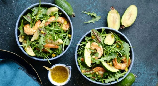 Описание: ✅ Салат из фейхоа с тигровыми креветками📌 НУЖНО (на 4 порции):🔹 400 г фейхоа🔹 300 г варёных очищенных креветок🔹 100 г руколы🔹 сок и цедра 1 маленького лимона🔹 70 мл оливкового масла🔹 1 ст. л. зернистой горчицы🔹 1 ч. л. мёда🔹 соль🔹 молотый чёрный перец🔹 рубленые фисташки для подачи📌 ГОТОВКА:🔵 Чтобы приготовить салат с фейхоа и креветками, у фейхоа удалите кожуру, если она жёсткая. Нарежьте фейхоа дольками, полейте половиной лимонного сока.🔵 Для заправки смешайте оставшийся лимонный сок, цедру, горчицу, мёд и масло, посолите и поперчите.🔵 Смешайте руколу с фейхоа и 1 ст. л. заправки, разложите по тарелкам. Сверху выложите креветки, полейте оставшейся заправкой, посыпьте орехами. Сразу же подавайте.🔥 НА ЗАМЕТКУ. Подавайте салат в тёплом виде, лучше – порционно. При подаче выложите креветки сверху и посыпьте рублеными фисташками, кедровыми или другими орехами на свой вкус.🔥 КСТАТИ. Рецепт салата предполагает тигровые креветки, но вы можете взять другие, например, королевские. Такое блюдо можно приготовить с другими морепродуктами – мидиями, морскими гребешками.