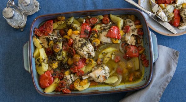 Описание: ✅ Курица, запечённая в духовке с овощами и травами📌 НУЖНО:🔹 1 целая курица (1,1-1,2 кг)🔹 800 г картофеля🔹 500 г помидоров черри🔹 3 средние моркови🔹 1 крупная луковица🔹 1 красный сладкий перец🔹 2-3 веточки петрушки🔹 2-3 веточки тимьяна🔹 1 веточка розмарина🔹 1⁄2 ч. л. сушёного чеснока🔹 1⁄2 ч. л. сушёного лука🔹 4 ст. л. растительного масла🔹 Соль, молотый чёрный перец📌 ГОТОВКА:🔷 Разогрейте духовку до 200 °C. Большую жаростойкую форму объёмом 4 л. смажьте растительным маслом.🔷 Разделайте курицу на 6 порционных кусков. Очищенный картофель нарежьте на дольки. Сладкий перец разрежьте вдоль пополам, удалите семена и перегородки, половинки нарежьте крупными квадратами. Помидоры черри разрежьте на половинки. Морковь нарежьте брусками, лук – толстыми перьями. Отделите от стеблей листья петрушки, тимьяна и розмарина и мелко порубите.🔷 На дно формы выложите лук и морковь, посыпьте половиной зелени и сбрызните растительным маслом. Сверху выложите курицу, картофель, сладкий перец и помидоры черри. Посолите, приправьте перцем, сушёным луком и чесноком, добавьте оставшуюся зелень. Накройте форму фольгой и поместите в духовку на 30 мин.🔷 Снимите фольгу и продолжайте запекать курицу ещё 30 мин. Картофель и курица должны легко протыкаться кончиком ножа. Если потребуется, готовьте ещё 5-7 мин., до образования золотистой корочки.