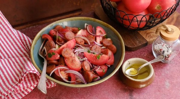 Название: Салат с помидорами, красным луком и чоризо