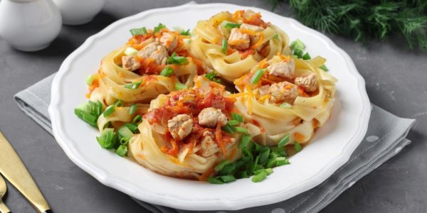 Описание: 🥣 Гнёзда из макарон с курицей и овощами✅ НУЖНО:🔹 Куриное филе – 250 г🔹 Репчатый лук – 1 штука🔹 Морковь – 1 штука🔹 Помидоры – 3 штуки🔹 Растительное масло – 1 ст. ложка🔹 Соль – по вкусу🔹 Приправа для курицы – по вкусу🔹 Гнёзда из макарон – 5 штук✅ ГОТОВКА:🔷 Нарежьте курицу небольшими кусочками. Порубите лук. Натрите морковь.🔷 Помидоры можно мелко нарезать ножом или измельчить в блендере.🔥 Вместо свежих помидоров можно взять резаные томаты в собственном соку.🔷 Разогрейте в сковороде масло. Слегка подрумяньте со всех сторон курицу, добавьте соль и приправу.🔷 Всыпьте лук и морковь, обжарьте. Добавьте помидоры, немного воды и соль. Тушите минут 10, до мягкости овощей.🔷 За это время отварите макаронные гнёзда в подсоленной воде по инструкции с упаковки. Это займёт примерно 7 минут.🔷 Подавайте гнёзда из макарон, полив мясным соусом.