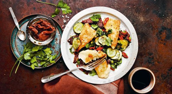 Описание: 🥣 Салат с жареным сулугуни✅ НУЖНО:🔹 500 г сулугуни🔹 1 яйцо🔹 100 г панировочных сухарей🔹 60 г сливочного масла🔹 2 ст. л. оливкового масла👉 Для салата:🔹 6 вяленых помидоров🔹 2 огурца🔹 1 красный перец чили🔹 4-5 веточек кинзы🔹 1 ст. л. соевого соуса🔹 2 ст. л. горчичного масла✅ ГОТОВКА:🔷 Нарежьте огурцы тонкими кружками. Вяленые помидоры нарежьте ломтиками. Удалите семена у перца чили, стручок нарежьте кольцами. Крупно нарежьте кинзу. Соедините овощи и зелень в салатнике, полейте соевым соусом и горчичным маслом и перемешайте.🔷 Нарежьте сулугуни ломтиками толщиной 1,5 см. Взбейте яйцо, сухари насыпьте в тарелку. Обмакните ломтики сулугуни во взбитое яйцо и запанируйте в сухарях.🔷 В большой сковороде с антипригарным покрытием разогрейте оливковое масло, добавьте сливочное и выложите ломтики сыра. Жарьте на среднем огне по 2-3 мин с каждой стороны. Разложите на тарелки салат и сулугуни и сразу подавайте к столу.🔥 НА ЗАМЕТКУ. Отличную пару жареному сулугуни составят и гранатовый соус наршараб, и сливовый ткемали – любой из них будет уместен в заправке к этому салату.🔥 КСТАТИ. Хорошо разогрейте сковороду и масло в ней, прежде чем обжаривать сыр, чтобы хрустящая корочка образовалась максимально быстро.