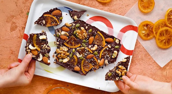 Описание: 🥣 Домашний шоколад с орехами✅ НУЖНО:🔹 200 г тёмного шоколада🔹 50 г орехов (миндаль, кешью, грецкие орехи, арахис)🔹 50 г семечек (тыквенных, подсолнечных, чиа, кунжута)🔹 40 г апельсиновых цукатов🔹 40 г вяленой клюквы✅ ГОТОВКА:➡️ Порубите ножом орехи и цукаты и сложите в миску. Добавьте семечки и половину цукатов (если цукаты крупные, нарежьте их).➡️ Наломайте шоколад и поместите в миску, установленную на водяной бане. Нагревайте шоколад, пока он не расплавится. Всыпьте ореховую смесь и перемешайте лопаткой.➡️ Перелейте массу в форму, застеленную пищевой плёнкой, разровняйте, разложите сверху оставшиеся цукаты и вяленую клюкву и уберите в холодильник на 2 ч.🔥 НА ЗАМЕТКУ. Вы можете добавить к расплавленному шоколаду орехи только одного вида, например, миндаль, фундук, пекан или кешью, либо использовать любую ореховую смесь. То же относится и к семечкам, и к цукатам: выбирайте наполнители шоколада по своему вкусу.🔥 КСТАТИ. Растопить шоколад можно не только на водяной бане, но и в микроволновой печи. Для этого поломайте шоколад в подходящую миску и используйте короткие циклы на малой мощности (например, в режиме разморозки) по 10-20 секунд, перемешивая содержимое миски после каждого цикла.