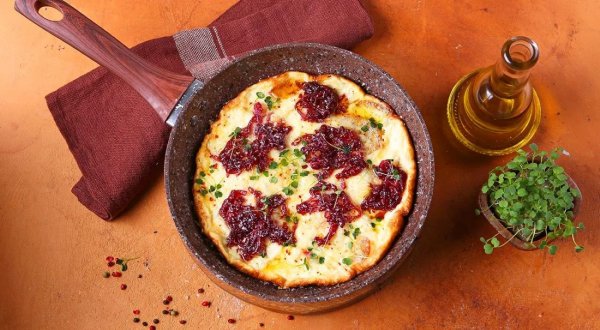 Описание: 🥣 Тортилья с картофелем и карамелизированным луком✅ НУЖНО:🔹 500 г картофеля🔹 6 яиц🔹 60 г тёртого пармезана🔹 2 ст. л. сливок🔹 4 веточки тимьяна🔹 4 ст. л. оливкового масла🔹 соль🔹 молотый чёрный перец🔹 микрозелень для подачи👉 Для карамелизированного лука:🔹 1 крупная красная луковица🔹 50 мл белого сухого вина🔹 2 ст. л. винного уксуса🔹 3 ст. л. оливкового масла🔹 2 ч. л. мёда✅ ГОТОВКА:➡️ Нарежьте лук кольцами. В сковороде разогрейте масло и выложите лук. Готовьте на медленном огне, помешивая, 10 мин. Посолите, добавьте вино, винный уксус и мёд и готовьте еще 7 мин.➡️ Почистите картофель и нарежьте тонкими кружками, залейте горячей водой, посолите и варите 5 мин. Слейте отвар, картофель обсушите.➡️ В большой миске соедините яйца с половиной тёртого пармезана и сливками, добавьте листья тимьяна, соль, перец и тщательно перемешайте.➡️ В сковороде разогрейте оливковое масло. Обжарьте картофель со всех сторон до золотистого цвета, 5 мин, уменьшите нагрев до минимального.➡️ Вылейте в сковороду яичную смесь, накройте крышкой и готовьте 10 мин. Когда яйца схватятся – тортилья готова. Снимите с огня, посыпьте оставшимся пармезаном, сверху выложите карамелизированный лук и украсьте тортилью микрозеленью.🔥 НА ЗАМЕТКУ. Лучше всего для тортильи подходит сковорода с высокими бортиками и толстым дном, без пластиковых деталей, в которой можно готовить и на плите, и в духовке. Ведь этот испанский омлет можно не только жарить, но и запечь.🔥 КСТАТИ. Тортилья в своём классическом варианте всегда поджаривается с обеих сторон. Вы можете сделать так же: возьмите тарелку или плоскую крышку по диаметру сковороды и, как только омлет схватится, переверните его на другую сторону и слегка подрумяньте.