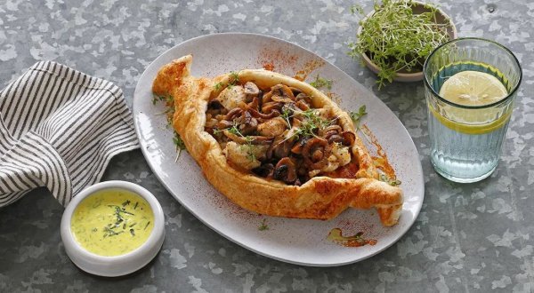 Описание: 🥣 Белая рыба с грибами в слоёном тесте✅ НУЖНО:🔹 300 г слоёного бездрожжевого теста🔹 500 г филе белой рыбы🔹 200 г ассорти грибов🔹 1 луковица🔹 1 ст. л. лимонного сока🔹 растительное масло🔹 соль🔹 молотый чёрный перец🔹 микрозелень для подачи👉 Для соуса:🔹 4 ст. л. творожного сыра с зеленью🔹 80 мл сливок🔹 150 мл вермута🔹 100 мл овощного бульона🔹 1 лимон🔹 1 луковица🔹 2 веточки петрушки🔹 1 ст. л. растительного масла🔹 1 ч. л. молотой куркумы🔹 соль🔹 молотый чёрный перец✅ ГОТОВКА:➡️ Заранее разморозьте слоёное тесто. Разогрейте духовку до 200°C. Застелите противень бумагой для выпечки. Обсушите филе бумажными полотенцами и нарежьте небольшими кусочками. Сбрызните лимонным соком, посолите и посыпьте перцем.➡️ Лук нарежьте кольцами, грибы – ломтиками. В сковороде разогрейте растительное масло и потушите лук до прозрачности, 5 мин. Добавьте грибы, посолите, приправьте перцем и готовьте на среднем огне ещё 5 мин.➡️ Раскатайте слоёное тесто в пласт толщиной 5-7 мм, переложите на противень. В середине разместите рыбу, не доходя до края теста 2 см. Выложите на рыбу грибы с луком. Сформируйте из теста лодочку, скрутив концы, как фантик конфеты. Поместите противень на средний уровень духовки и запекайте 5 мин. Уменьшите нагрев до 180°C и продолжайте готовить ещё 20 мин.➡️ Вымойте лимон в горячей воде жёсткой щёткой. Мелкой тёркой снимите 1 ч. л. цедры, из половинки выжмите сок. Нарежьте лук небольшими кубиками. Измельчите листья петрушки. В глубокой сковороде разогрейте растительное масло и обжарьте лук, 5 мин. Добавьте куркуму, цедру, влейте вермут, сливки и овощной бульон, посолите и готовьте на медленном огне 7 мин. Добавьте в соус творожный сыр и петрушку, перемешайте и снимите с огня.➡️ Переложите рыбу на блюдо, посыпьте микрозеленью и полейте небольшим количеством соуса. Оставшийся соус подайте отдельно.🔥 НА ЗАМЕТКУ. Для приготовления рыбной запеканки можно использовать свежее или замороженное филе. Выбрав филе, обязательно проверьте его на отсутствие костей перед готовкой. Даже мелкие косточки в рыбном пироге станут не очень приятной находкой для едоков. Вместо ассорти грибов вы также можете использовать универсальные шампиньоны.🔥 КСТАТИ. Под названием «белая рыба» скрывается достаточно большой список морских и речных обитателей на любой вкус. Из самых известных, которые можно найти на прилавках магазинов – дорада, палтус, камбала, масляная, хек, треска, пангасиус, минтай, тилапия, судак, окунь, карп, сазан и прочие. Белая рыба обычно менее жирная, чем красная, но не менее полезная. Её часто рекомендуют для диетического и ЗОЖ меню. Если используете для этого блюда филе трески или морского окуня, добавьте к рыбе 30 г натёртого на тёрке сливочного масла, чтобы начинка была сочнее.
