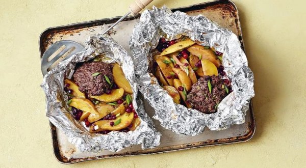 Описание: 🥣 Запечённые говяжьи котлеты с картофелем и клюквой✅ Нужно:🔹 400 г фарша из говядины🔹 4 средние картофелины🔹 2-3 стебля зелёного лука🔹 4 ст. л. свежей клюквы (можно заменить на замороженную)🔹 1 маленькая веточка розмарина🔹 соль🔹 перец чёрный молотый🔹 оливковое масло✅ Готовка:➡️ Разогрейте духовку до 200 °C. Отрежьте 4 листа фольги размером 30 х 25 см и разложите на противне. Нарежьте картофель тонкими ломтиками и посолите. Мелко нарежьте зелёный лук. Отделите от стебля и измельчите листья розмарина.➡️ Соедините фарш с розмарином и половиной зелёного лука, посолите, приправьте молотым чёрным перцем и тщательно перемешайте. Мокрыми руками сформируйте 4 котлеты.➡️ На середину каждого листа фольги выложите картофель и котлету, добавьте 1 ст. л. клюквы. Сбрызните оливковым маслом и сверните фольгу конвертом. Поместите противень в духовку и запекайте 40 мин. Раскройте конверты и посыпьте блюдо оставшимся зелёным луком.🔥 НА ЗАМЕТКУ. Вместо картофеля в этом рецепте можно использовать и другие овощи – цуккини, кабачки, баклажаны, сладкий перец, томаты или их сочетание.🔥 КСТАТИ. Чтобы котлеты получились более плотными и хорошо держали форму, с усилием отбейте готовый фарш о дно миски 5-7 раз и только потом формируйте из него котлеты.