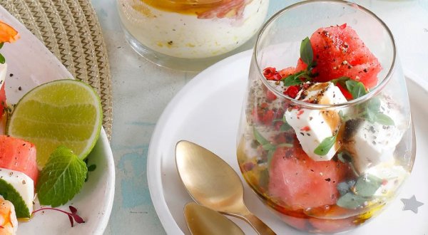 Описание: 🥣 Веррины с сыром бри и арбузом✅ Нужно:🔹 200 г мякоти арбуза🔹 150 г сыра бри🔹 3 ст. л. оливкового масла🔹 1 ст. л. светлого бальзамического уксуса🔹 молотая смесь перцев🔹 базилик для украшения🔹 бальзамический уксус для украшения✅ Готовка🔵 Нарежьте арбуз кубиками со стороной 1,5 см. Сыр бри нарежьте кубиками такого же размера.🔵 В небольшую миску влейте оливковое масло и светлый бальзамический уксус и взбейте.🔵 Разложите арбуз и сыр в стаканчики, полейте заправкой и посыпьте смесью перцев. Сбрызните бальзамическим уксусом и украсьте базиликом.🔥 НА ЗАМЕТКУ. Ингредиенты закуски можно подготовить заранее и хранить в холодильнике в отдельных герметично закрытых контейнерах, а вот соединять их друг с другом стоит непосредственно перед подачей на стол.🔥 КСТАТИ. Отличным дополнением для такого салата станут обжаренные семечки или рубленные орехи – посыпьте ими закуску перед подачей, так разнообразие текстур в блюде станет ещё более богатым.