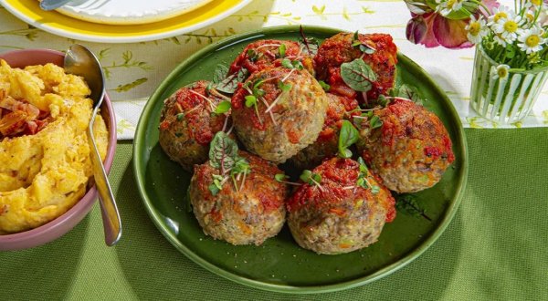Описание: 🥣 Куриные тефтели с овощами✅ Нужно:🔹 500 г говяжьего фарша🔹 500 г куриного фарша🔹 250 г моркови🔹 300 г кабачков🔹 300 г лука🔹 6 зубчиков чеснока🔹 1 пучок зелени🔹 4 ст. л. томатного соуса🔹 2 ст. л. топлёного масла🔹 1 ст. л. смеси специй на выбор (карри, хмели-сунели, «для мяса» и т. д.)🔹 соль🔹 молотый чёрный перец✅ Готовка🔵 Очистите лук, чеснок и морковь, натрите на крупной тёрке. Затем натрите кабачки. В большой сковороде нагрейте немного масла, положите овощи и на сильном огне быстро обжарьте небольшими партиями, по 2 мин каждую партию (если жарить всё вместе, овощи пустят сок). Остудите овощи.🔵 Смешайте оба вида фарша и овощи. Порубите зелень, посыпав её солью, как можно мельче. Вмешайте зелень и смесь специй в фарш. Накройте и поставьте в холодильник минимум на 1 ч.🔵 Разогрейте духовку до максимума – 240-250°С, желательно в режиме конвекции. Подготовьте 20 формочек для маффинов (можно использовать одноразовые из фольги), сбрызните каждую водой. Разделите фарш на 20 равных частей.🔵 Мокрыми руками берите каждую часть фарша, делайте плотный шарик, кладите в формочку.🔵 Разведите томатный соус 2 ст. л. воды и кисточкой смажьте каждую тефтельку. Установите формочки на противень, поставьте в верхнюю треть духовки. Через 5 мин уменьшите температуру до 170°С, запекайте ещё 12-15 мин.🔥 НА ЗАМЕТКУ. Добавьте к фаршу для тефтелей стакан риса, сваренного до полуготовности, чтобы получились «ёжики». Для ПП-версии используйте дикий или бурый рис.🔥 КСТАТИ. Если в процессе приготовления поверхность тефтелей зарумянится слишком быстро, накройте их листом фольги и продолжайте готовить в соответствии с рецептом.