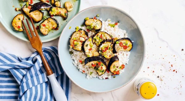 Описание: 🥣 Рис с баклажанами и чесночным соусом✅ Нужно:🔹 200 г риса🔹 2 средних баклажана🔹 6 зубчиков чеснока🔹 1 стебель зелёного лука🔹 1 красный перец чили🔹 1-2 ст. л. соевого соуса🔹 3 ст. л. растительного масла🔹 ¼ ч. л. сахара🔹 соль✅ Готовка 🔵 Всыпьте рис в сотейник, посолите, полейте 1 ч. л. растительного масла и обжарьте на среднем огне, 2 мин. Влейте 300 мл горячей воды и доведите до кипения. Уменьшите нагрев до минимального, накройте сотейник крышкой и готовьте 12-14 мин.🔵 Измельчите чеснок, зелёный лук и чили, сложите в жаростойкую миску, добавьте ½ ч. л. соли и посыпьте сахаром. В небольшой сковороде разогрейте на средне-сильном огне растительное масло, 3 мин. Полейте маслом чесночную смесь и перемешайте.🔵 Разрежьте баклажаны вдоль, половинки нарежьте ломтиками толщиной 1,5 см и разложите в поддоне пароварки. Налейте в пароварку воду согласно инструкции и готовьте баклажаны в течение 10 мин. Полейте баклажаны чесночным соусом и продолжайте готовить ещё 5-7 мин.🔵 Разложите в тарелки приготовленный горячий рис и добавьте баклажаны вместе с чесночным соусом.🔥 НА ЗАМЕТКУ. Рис с баклажанами по этой рецептуре можно приготовить в виде плова, используя казан или мультиварку в режиме «Плов». В этом случае баклажан нужно порезать не кружками, а кубиками. Для приготовления подойдут готовые специи – молотый чеснок для соуса, куркума для риса, смесь специй для плова. Можно использовать также паприку и добавить сладкий перец.🔥 КСТАТИ. Чтобы сделать блюдо с баклажанами ещё более полезным, можно выбрать бурый рис. Готовится он дольше обычного, зато в таком необработанном рисе гораздо больше микро- и макроэлементов.