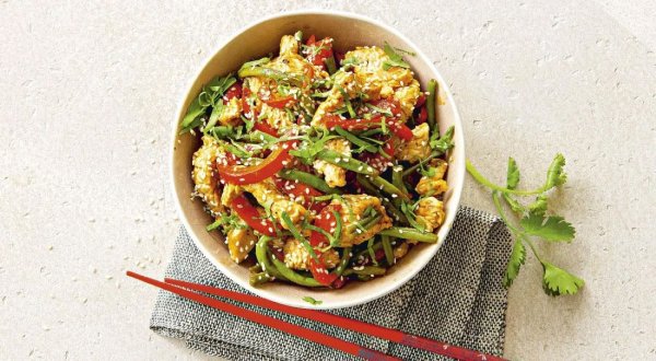 Описание: 🥣 Индейка со стручковой фасолью и болгарским перцем✅ Нужно:🔹 600 г филе индейки🔹 1 красный сладкий перец🔹 200 г стручковой фасоли🔹 3 ст. л. соуса терияки🔹 2 ст. л. кунжута🔹 4 ст. л. растительного масла🔹 чесночный порошок🔹 1 ст. л. лимонного сока🔹 соль, перец чёрный молотый🔹 кинза или петрушка для украшения✅ Готовка🔵 Чтобы приготовить индейку с фасолью, нарежьте филе индейки тонкими полосками. Сладкий перец разрежьте вдоль, удалите семена и перегородки, нарежьте соломкой.🔵 Разогрейте на гриле вок или глубокую сковороду, влейте 4 ст. л. растительного масла, положите перец и фасоль и готовьте, часто перемешивая, 4 мин. Добавьте индейку, посолите, приправьте чесночным порошком и молотым чёрным перцем. Продолжайте готовить на сильном огне, постоянно перемешивая и встряхивая сковороду, ещё 7 мин.🔵 Влейте соус терияки и 1 ст. л. лимонного сока, тщательно перемешайте и прогревайте 2 мин. Разложите в тарелки, посыпьте кунжутом и украсьте мелко нарезанной кинзой или петрушкой.🔥 НА ЗАМЕТКУ. Индейка со стручковой фасолью будет особенно хороша в горячем виде, но можно подать её и холодной. Филе, приготовленное в азиатском стиле, отлично сочетается с рисом и овощными салатами.🔥 КСТАТИ. Все ингредиенты для стир-фрая должны быть небольшого размера. То есть индейка должна быть нарезана достаточно мелкими кусочками, чтобы мясо успело прожариться.