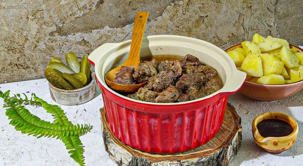 Описание: 🥣 Карельское жаркое✅ Нужно:🔹 Свинина 500 г🔹 Говядина 500 г🔹 Говяжьи почки 200 г🔹 Говяжья печень 100 г🔹 Лук репчатый 2 шт.🔹 Соль по вкусу🔹 Перец чёрный молотый по вкусу👉 Для подачи:🔹 Картофель 5 шт.🔹 Соус брусничный по вкусу🔹 Огурец маринованный по вкусу✅ Готовка🔵 Разрежьте почки вдоль, удалите жир и протоки. Положите в миску, залейте холодной водой и вымачивайте не менее 4 часов. Каждый час желательно менять воду. 🔵 С печёнки удалите плёнки, жир и протоки. Подготовленные почки и печёнку крупно нарежьте. Говядину и свинину обсушите бумажными полотенцами и нарежьте кубиками со стороной 3 см. Лук нарежьте полукольцами. 🔵 Разогрейте духовку до 180 °С. В жаровню положите мясо. Добавьте лук, печёнку и почки, посолите, приправьте перцем и влейте 1 л горячей воды. Накройте крышкой, поместите в центре духовки на решётку и томите жаркое в течение 2,5-3 ч. 🔵 Очищенный картофель разрежьте на 2-4 части, мелкие картофелины можно оставить целыми. Положите картофель в кастрюлю с горячей водой, посолите и готовьте 20-25 мин. Слейте отвар, картофель обсушите. 🔵 Подавайте жаркое с горячим картофелем, маринованными огурцами и брусничным соусом. 🔥 НА ЗАМЕТКУ. Карельская кухня не особо богата мясными блюдами. Но жаркое из нескольких видов мяса и субпродуктов, томлёное в духовке или в печи — такая же визитная карточка региона, как и пирожки-калитки. Простое сытное блюдо когда-то готовили по большим праздникам, а теперь его рецепт вошёл и в повседневное меню. Правда, готовится оно не быстро. В первую очередь потому, что нужно обязательно вымочить почки (для удаления острого характерного запаха). Ну, и само мясо — свинина и говядина — тушится в течение 2-3 часов.