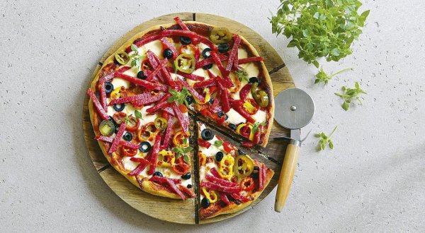 Описание: 🥣 Пицца с салями✅ Нужно:🔹 готовая основа для пиццы – 1 шт.🔹 салями – 120 г🔹 сыр – 80 г🔹 сладкий красный перец – 1 шт.🔹 маслины без косточек – 8 шт.🔹 маринованный халапеньо – 3 ст. л.🔹 томатный соус – 4 ст. л.🔹 натуральный йогурт – 2 ст. л.🔹 оливковое масло – 2 ст. л.🔹 базилик – 1 веточка🔹 соль, молотый чёрный перец✅ Готовка🔵 Разморозьте тесто для пиццы. Разогрейте духовку и противень до 220 ° С.🔵 Нарежьте салями соломкой. Натрите сыр. Удалите семена и плодоножку сладкого перца, стручок нарежьте тонкими кольцами. Оливки также нарежьте кольцами. Соедините томатный соус с йогуртом и 1 ст. л. оливкового масла, посолите, приправьте молотым перцем и перемешайте.🔵 Расстелите на рабочей поверхности лист бумаги для выпечки, выложите на него основу для пиццы и смажьте соусом. Посыпьте тёртым сыром, равномерно распределите кольца сладкого перца, оливок и халапеньо. Посыпьте ломтиками салями.🔵 Выньте из духовки горячий противень. Аккуратно перенесите на него пиццу вместе с бумагой. Верните противень в духовку и выпекайте пиццу в течение 10 мин.🔵 Готовую пиццу переложите на тарелку или на деревянную доску, сбрызните оставшимся оливковым маслом и украсьте листьями базилика.🔥 НА ЗАМЕТКУ. Готовую пиццу можно украсить не только свежим базиликом, но и другими травами. Отлично подойдёт пряная свежая руккола или шпинат. 🔥 КСТАТИ. Разогревайте духовку вместе с противнем, чтобы на пицце снизу получилась румяная корочка. А перенести пергамент с пиццей на противне удобнее всего с помощью обычной разделочной доски.