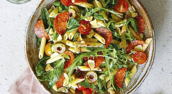 Описание: 🥣 Салат с салями✅ Нужно:🔹 салями – 150 г🔹 тёртый пармезан – 50 г🔹 помидоры черри – 200 г🔹 красный чили – 1 шт.🔹 оливки без косточек – 10 шт.🔹 чеснок – 1 зубчик🔹 перья (макароны) – 200 г🔹 салатный микс – 50 г🔹 оливковое масло "экстра вирджин" – 5 ст. л.🔹 аджика – 1 ст. л.🔹 лимонный сок – 1 ст. л.🔹 соль✅ Готовка🔵 Разогрейте духовку до 200 °С. Жаростойкую форму смажьте небольшим количеством оливкового масла.🔵 Нарежьте салями ломтиками. Измельчите чеснок. Помидоры черри разрежьте пополам. Удалите плодоножку и семена перца чили, стручок нарежьте тонким кольцами. Оливки также нарежьте кольцами.🔵 Сложите в форму помидоры и чили. Посолите, полейте оливковым маслом и запекайте в центре духовки в течение 10 мин.🔵 Вскипятите 1,5 л воды, посолите и всыпьте перья. Варите на сильном огне до упругости, примерно 8-9 мин. Отбросьте на дуршлаг, верните в кастрюлю и полейте 1 ст. л. оливкового масла. Накройте кастрюлю крышкой и несколько раз встряхните, чтобы перья покрылись маслом.🔵 Приготовьте заправку. В небольшую миску влейте оставшееся оливковое масло и лимонный сок, добавьте аджику и измельчённый чеснок. Посолите и тщательно взбейте венчиком или вилкой.🔵 В большом салатнике соедините отваренные перья, запечённые овощи, оливки и салями. Полейте заправкой и аккуратно перемешайте. Разложите в тарелки, посыпьте тёртым пармезаном и украсьте микс-салатом.🔥 НА ЗАМЕТКУ. Для этого салата можно использовать и обычные помидоры: используйте мясистые сорта и нарежьте их перед запеканием на 6-8 частей в зависимости от размера.🔥 КСТАТИ. После недолгого запекания в духовке помидоры гарантированно станут слаще, но если вам попались слишком уж кислые экземпляры, приправьте их перед запеканием щепоткой сахара.