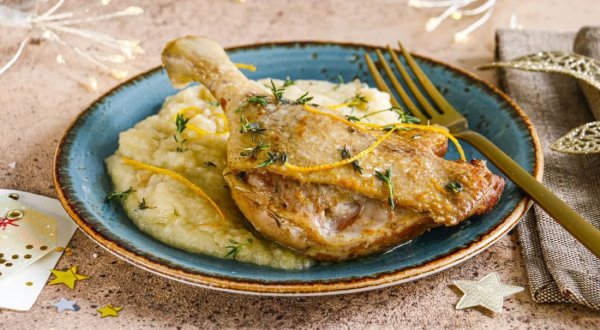 Описание: 🥣 Утиные ножки конфи с яблочным пюре📌 Нужно🔹 утиные ножки – 6 шт.🔹 яблоки – 1,2 кг🔹 апельсин – 1 шт.🔹 чеснок – 4 зубчика🔹 тимьян – 1 пучок🔹 дижонская горчица – 2 ч. л.🔹 соевый соус – 2 ст. л.🔹 сливочное масло – 120 г🔹 сахар🔹 соль🔹 лавровый лист🔹 палочка корицы🔹 растительное масло – 1 л📌 Готовка🔷 Утиные ножки важно правильно подготовить. Обсушите ножки бумажным полотенцем, внимательно проверьте на наличие перьев, удалите, если такие имеются. Если на ножках много жира, лишний срежьте.🔷 Два зубчика чеснока раздавите в ступке с щепоткой соли.🔷 Мелкой тёркой сотрите цедру с 1 апельсина и смешайте с чесночной пастой. Добавьте горчицу, соевый соус и 2-3 веточки тимьяна. Хорошо перемешайте и замаринуйте утиные ножки. Оставьте минимум на 1,5 ч, а лучше на 5-6 ч в холодильнике.🔷 В кастрюлю с толстым дном положите круг из пергамента. Ножки обсушите бумажным полотенцем и выложите в кастрюлю. Залейте растительным маслом так, чтобы ножки были полностью им покрыты. Добавьте в масло несколько веточек тимьяна, оставшийся чеснок, лавровый лист. Поставьте на медленный огонь и доведите масло до температуры 80 °С. Оно не должно кипеть, но должно быть видно движение масла. Готовьте 3-4 часа (это зависит от мягкости ножек, домашняя птица готовится дольше).🔷 Выложите на противень разрезанные на 4 части яблоки. Добавьте палочку корицы, тимьян, сливочное масло и перемешайте, накройте крышкой. Поставьте в разогретую до 200 °С духовку и запекайте 1 час. Удалите толстые веточки тимьяна, корицу. Пробейте яблоки блендером в пюре. Добавьте сахар по вкусу.🔷 Подавайте утиные ножки конфи с яблочным пюре, украсив тимьяном и апельсиновой цедрой.🔥 НА ЗАМЕТКУ. Снимать апельсиновую цедру можно специальным ножом для цедры, теркой или обычным ножом, важно помнить, что вам понадобится только цветная часть кожуры – белая передаст блюду ненужную горечь.🔥 КСТАТИ. Утиные ножки перед погружением в масло важно как следует обсушить от излишней влаги, не пренебрегайте этим этапом.