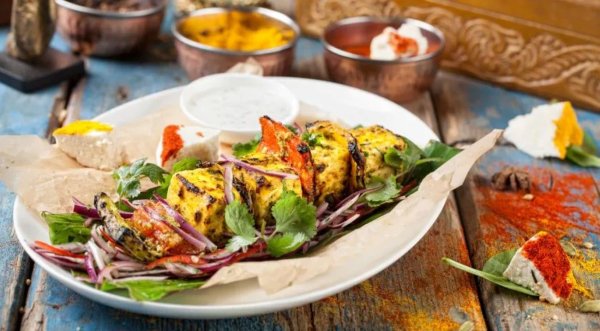 Описание: 🥣 Панир тикка - сыр запечённый со сладким перцем📌 Нужно (на 1 порцию)🔹 150 г домашнего сыра🔹 40 г сладкого перца🔹 лук для подачи🔹 кинза для подачи🔹 листья свежего салата для подачи👉 Для маринада:🔹 30 г помидоров🔹 20 г натурального йогурта🔹 3 г чеснока🔹 2 г куркумы🔹 1 г молотого перца чили🔹 10 г растительного масла🔹 5 г горчичного масла📌 Готовка🔷 Сыр нарежьте средними кусочками. Перец разрежьте пополам, удалите семена и сердцевину, нарежьте также средними кусочками.🔷 Смешайте все ингредиенты для маринада. Аккуратно добавьте сыр и перец, перемешайте и оставьте на 10-15 минут.🔷 Сыр и перец нанизайте поочерёдно на длинный деревянный шампур. Обжарьте с растительным маслом на сковороде со всех сторон до золотистого цвета, 3-4 минут. На тарелку положите листья салата и тонко нарезанный лук. Сверху - шампур с сыром и перцем. Украсьте луком, листьями базилика и кинзы.🔥 НА ЗАМЕТКУ. Этот рецепт назван в честь индийского сыра панир, который в наших условиях можно заменить адыгейским или соевым сыром - тофу. Перед вами московская вариация на тему известного национального блюда. Если хотите добавить аутентичности, не забудьте приправить сыр гарам масалой, щепоткой асафетиды и усилить вкус имбирём.