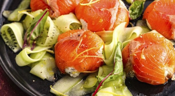 Описание: 🥣 Тимбали из лосося с огуречным папарделле📌 Нужно🔹 филе слабосолёного или копчёного лосося - 300 г🔹 варёное мясо крабов - 200 г🔹 твёрдый сыр - 150 г🔹 сливочный сыр - 100 г🔹 сливки жирностью 35% - 100 мл🔹 укроп - 2 пучка👉 Для папарделле:🔹 салатный огурец - 1 большой🔹 оливковое масло - 100 мл🔹 соль🔹 винный уксус - 2 ст. л.🔹 сахар - 2 ст. л.🔹 сок и цедра 1 лимона📌 Готовка🔷 Укроп измельчите. Мясо краба разберите на волокна, удалив хитиновые пластины. Сливочный сыр взбейте со сливками, добавьте натёртый сыр, крабовое мясо и измельчённый укроп, перемешайте.🔷 Филе лосося нарежьте на 16 тонких полосок.🔷 Застелите плёнкой 8 формочек диаметром 8-10 см, поместите в каждую крест-накрест по 2 полоски рыбы так, чтобы свешивались края.🔷 Выложите на рыбу по 2-3 ст. л. начинки. Накройте свободными краями; края должны находить друг на друга на 2,5 см. Прикройте пищевой плёнкой, прижмите и поставьте в холодильник на 2 часа.🔷 В сотейнике вскипятите 3 ст. л. воды с сахаром. Добавьте цедру и сок лимона, оливковое масло и уксус. Посолите по вкусу и ещё раз доведите до кипения. Снимите с огня и дайте полностью остыть.🔷 Огурец очистите. С помощью овощечистки нарежьте мякоть тонкими длинными лентами. Перед подачей на стол выньте тимбали из формочек, поместите на блюдо. Рядом выложите огуречную «лапшу», сбрызните приготовленной заправкой. Украсьте блюдо мангольдом.🔥 НА ЗАМЕТКУ. Мясо краба можно использовать консервированное. Либо, как вариант, заменить варёными креветками или крилем. Закуску можно дополнительно украсить красной икрой.🔥 КСТАТИ. Тимбали или тимбаль - блюдо французской кухни. Его можно приготовить из любой красной рыбы на своё усмотрение. Оставьте закуску в холодильнике на 2-3 часа перед подачей, чтобы она хорошо застыла.