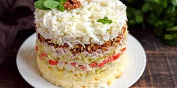 Описание: 🥣 Салат «Снежная королева» с крабовыми палочками📌 Нужно🔹 Яйца – 3 штуки🔹 Крабовые палочки – 200 г🔹 Ветчина – 100 г🔹 Небольшая луковица – 1 штука🔹 Грецкие орехи или арахис – 100 г🔹 Крупное яблоко – 1 штука🔹 Плавленые сырки – 300 г🔹 Майонез – по вкусу📌 Готовка✅ Отварите яйца вкрутую примерно за 10 минут. Остудите и очистите.✅ Нарежьте мелкими кубиками крабовые палочки, ветчину и лук. Лук можно бланшировать крутым кипятком, чтобы убрать горечь.✅ Измельчите грецкие орехи или арахис.✅ Желтки, белки, яблоко и подмороженные сырки по отдельности натрите на тёрке. ✅ Выложите салат (в разъёмной форме, если она есть) слоями в такой последовательности: сыр, желтки, лук, крабовые палочки, яблоко, ветчина, белки и орехи. Все слои смазывайте майонезом, кроме последнего.🔥 НА ЗАМЕТКУ. Верхним слоем можно сделать белки, чтобы салат выглядел «снежным».
