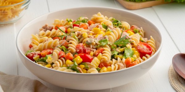 Название: Тёплый салат с макаронами, тунцом и кукурузой