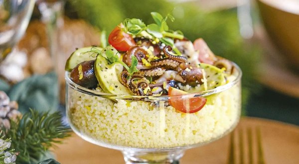 Описание: 🥣 Салат с авокадо и осьминогом📌 Нужно✔ маленьких замороженных осьминогов - 200 г✔ авокадо - 1 шт.✔ помидоры черри - 12 шт.✔ кускус - 100 г✔ сок и цедра 1 лимона✔ оливковое масло – 3 ст. л.✔ соль✔ зелень для украшения📌 Готовка➤ Осьминогов, не размораживая, положите в кастрюлю с 1,5 л холодной подсоленной воды. Поставьте на сильный огонь, доведите до кипения. Сразу же снимите с огня и оставьте на 10 мин., затем переложите в миску и остудите.➤ Лимонную цедру измельчите. Кускус залейте кипятком, подождите, пока вся жидкость не впитается. Добавьте цедру и 1 ст. л. масла, перемешайте вилкой и дайте немного остыть.➤ Авокадо очистите, нарежьте тонкими дольками, добавьте к осьминогам вместе с лимонным соком и оставшимся маслом, посолите и перемешайте.➤ Кускус разложите по креманкам, выложите смесь авокадо и осьминогов, а также разрезанные пополам помидоры черри и зелень.❗ НА ЗАМЕТКУ. Для украшения салата можно использовать ростки микрозелени, так его подача станет ещё интереснее.❗ КСТАТИ. Если в вашем распоряжении есть чуть больше времени, заправьте распаренный кускус оливковым маслом, перемешайте и поместите на 10 минут в духовку, разогретую до 200 градусов, чтобы немного подрумянить. Достаньте кускус из духовки и смешайте его с лимонной цедрой и горстью обжаренных на сухой сковороде кедровых орешков.