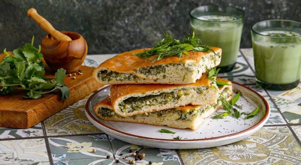 Описание: 🥣 Осетинский пирог c сыром и зеленью📌 Нужно👉 Для теста:• мука пшеничная – 2 стакана• кефир – 250 мл• масло сливочное – 100 г• дрожжи сухие – 7 г• соль – 0,5 ч. л.👉 Для начинки:• укроп – 150 г• зелёный лук – 150 г• осетинский сыр – 150 г• сметана – 100 г📌 Готовка➦ Для теста муку и соль просейте горкой в большую миску, смешайте с сухими дрожжами. В середине горки сделайте углубление и влейте кефир, добавьте 50 г размягчённого сливочного масла. Замесите мягкое тесто, накройте плёнкой и поставьте в тёплое место на 1,5-2 ч, пока тесто не увеличится вдвое.➦ Приготовьте начинку. Зелёный лук и укроп мелко нарежьте. Сыр натрите на крупной тёрке и смешайте с зеленью. В начинку добавьте сметану, посолите, если нужно, и перемешайте.➦ Раскатайте тесто пирога в круг толщиной 1-1,5 см. Выложите начинку на тесто, не доходя до края 2-3 см.➦ Вытягивая руками концы лепёшки, постепенно стяните их к центру. Хорошо защипните края теста.➦ Руками разровняйте поверхность пирога, он должен быть одинаковой толщины. Переложите его в смазанную маслом круглую форму швом вниз и ещё раз разровняйте так, чтобы толщина пирога была не более 1,5-2 см. В середине сделайте отверстие и вставьте трубочку из пергамента или фольги.➦ Разогрейте духовку до 200 °С. Выпекайте пирог 12-15 мин, до слегка золотистого цвета. Дайте немного остыть и обильно смажьте оставшимся сливочным маслом. Подавайте пирог горячим или тёплым.❗ НА ЗАМЕТКУ. Если вы желаете, чтобы осетинские пироги с сыром и зеленью получились не такими пышными, раскатывайте тесто потоньше (только старайтесь, чтобы при заворачивании начинки оно не порвалось).❗ КСТАТИ. Осетинский сыр в начинке пирогов с зеленью вы можете заменить адыгейским (он иногда называется также «кавказским») или высококачественным сухим жирным творогом.