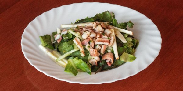 Описание: 🥣 Тёплый салат с кальмарами и яблоками📌 Нужно⇨ Оливковое масло – 2 ст. ложки⇨ Французская горчица – 1 ч. ложка⇨ Жидкий мёд – 1 ч. ложка⇨ Соль – по вкусу⇨ Молотый чёрный перец – по вкусу⇨ Листья салата – 1 пучок⇨ Крупное яблоко – 1 штука⇨ Средние огурцы – 2 штуки⇨ Лимон – 1 штука⇨ Кальмары – 2 штуки⇨ Чеснок – 1 зубчик⇨ Петрушка – несколько веточек📌 Готовка➦ Приготовьте заправку для салата. Для этого в маленьком контейнере или баночке с крышкой смешайте оливковое масло, горчицу, мёд. Добавьте соль и перец по вкусу. Закройте крышкой и хорошенько взболтайте.➦ Листья салата тщательно помойте, высушите и порвите руками на небольшие кусочки.➦ Яблоко и огурцы порежьте соломкой. Фрукт слегка сбрызните лимонным соком, чтобы оно не потемнело.➦ Смешайте яблоко, огурцы и листья салата. Выложите на большое плоское блюдо.➦ Тушки кальмара очистите от плёночек и порежьте на небольшие квадратные ломтики. Чеснок и петрушку мелко порубите. С помощью мелкой тёрки счистите цедру с лимона.➦ На разогретой сковороде в течение минуты обжарьте кусочки кальмара. Добавьте чеснок, петрушку, цедру лимона. Посолите. Слегка сбрызните лимонным соком. Перемешайте и снимите с огня. ➦ Выложите обжаренные морепродукты на смесь салата с яблоком и огурцом. Заправку взболтайте и полейте ей салат. Подавайте тёплым.❗ НА ЗАМЕТКУ. Главное в этом рецепте — не передержать кальмаров, иначе они станут жёсткими и резиновыми.❗ КСТАТИ. Рекомендуют готовить кальмаров с секундомером, чтобы снять с огня ровно через минуту.