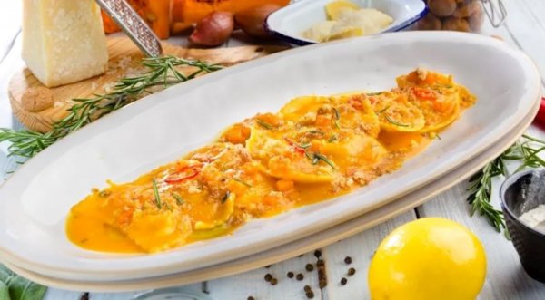 Описание: 🥣 Панцеротти с тыквой✅ Нужно👉 Для теста:⇨ 100 г муки для пасты⇨ 1 очень свежее яйцо⇨ соль👉 Для начинки:⇨ 100 г мякоти тыквы⇨ 20 г лука⇨ 35 г молодого свежего сыра, лучше рикотты⇨ 3 г чеснока⇨ 2 г шалфея⇨ 5 мл лимонного сока⇨ 15 г твёрдого выдержанного сыра, лучше пармезана + для подачи⇨ 5 г мягкой по вкусу горчицы⇨ 2 г перца чили⇨ 10 г оливкового масла Extra Virgin⇨ листики с 1 веточки розмарина⇨ листики с 2 веточек тимьяна⇨ соль, молотый чёрный перец👉 Для подачи:⇨ 10 г орехового итальянского печенья, лучше амаретти✅ Готовка➦ Для пасты муку просейте на стол горкой. В центр разбейте яйцо, посолите и взбейте яйцо до однородности вилкой. Подмешивая муку, замесите тесто руками. Сформируйте шар, оберните пищевой плёнкой, уберите в холодильник на 15-20 мин. Достаньте тесто и раскатайте его в тонкий слой скалкой. Можете использовать для этого специальную машинку для приготовления итальянской пасты.➦ Для начинки тыкву нарежьте средними кубиками, сбрызните оливоквым маслом и перемешайте с розмарином и тимьяном. Переложите в жаропрочную форму и запеките при 180 °С, 20-30 мин.➦ На сковороде обжарьте на оливковом масле мелко нарезанный лук, чеснок и чили (без семян или с ними, по желанию), 5-6 мин. Добавьте в самом конце приготовления запечённую тыкву.➦ Полностью остудите. Переложите в чашу блендера, добавьте оставшиеся ингредиенты для начинки, кроме рикотты. Измельчите до однородности.➦ Переложите начинку в миску, добавьте рикотту и перемешайте.➦ Разрежьте тесто на квадратные куски, разложите начинку и сформируйте пасту в форме полумесяца. Тщательно скрепите "шов".➦ Отварите пасту в кипящей воде, 2 мин.➦ Разложите пасту по тарелкам, украсьте крошками печенья, мелко нарезанным розмарином и пармезаном.❗ НА ЗАМЕТКУ. Панцеротти (panzerotti) в классическом понимании — это жаренные во фритюре пирожки с разнообразной начинкой из Апулии — области на юго-востоке Италии. Подавать готовые панцеротти нужно горячими, чтобы начинка не остыла. ❗ КСТАТИ. Рецепт предоставлен и разработан Маттео Лаи - с апреля 2025 года бренд-шеф ресторана Osteria Osso от Lucky Group в Москве.