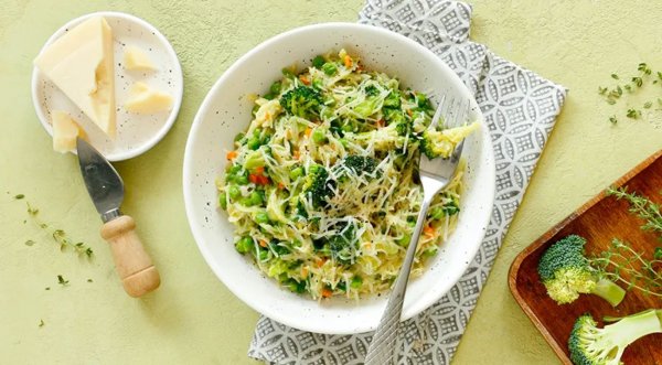 Описание: 🥣 Вермишель «Примавера»✅ Нужно⇨ вермишель – 400 г⇨ брокколи замороженная – 400 г⇨ горошек зелёный замороженный – 400 г⇨ морковь – 1 шт.⇨ лук зелёный – 50 г⇨ чеснок – 4 зубчика⇨ пармезан тёртый – 50 г⇨ сливочное масло – 50 г⇨ растительное масло – 1 ст. л.⇨ соль, молотый чёрный перец✅ Готовка➦ Раздавите, очистите и мелко порубите чеснок. Морковь очистите и нарежьте мелкими кубиками. Тонко нарежьте белую и светло-зелёную часть зелёного лука. Зелёную часть нарежьте кусочками 2 см и пока что отложите.➦ В глубоком сотейнике разогрейте на среднем огне растительное масло. Положите морковь, чеснок и белую часть зелёного лука, обжаривайте 2 мин.➦ Добавьте в сотейник брокколи и горошек, влейте 200 мл воды, доведите на сильном огне до кипения, посолите. Варите 2 мин., без крышки.➦ Всыпьте вермишель, варите, помешивая, 4-5 мин., без крышки. За это время вермишель должна приготовиться, а жидкость – впитаться.➦ Добавьте сливочное масло, пермезан и оставшийся зелёный лук. Посолите, поперчите. Прогрейте 20-30 сек. и подавайте.❗ НА ЗАМЕТКУ. Вермишель «Примавера» — один из самых известных рецептов итальянской кухни. В состав соуса входят нежные молодые овощи, преимущественно зелёного цвета. В этом рецепте используются замороженные брокколи и зелёный горошек, но в сезон вы можете использовать свежие овощи, дополнив их молодой спаржей, цукини и даже редисом.❗ КСТАТИ. Замороженные брокколи и зелёный горошек не понадобится предварительно размораживать, вы можете добавить их в сотейник прямо из пакета. Впрочем, если соцветия брокколи слишком крупные, их лучше порубить на более мелкие кусочки.