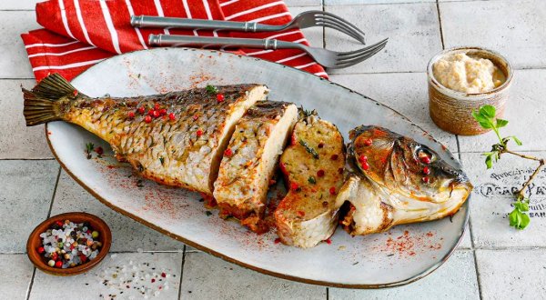 Описание: 🥣 Фаршированная рыба по-одесски✅ Нужно⇨ Карп свежий – 1,5 кг⇨ Лук репчатый – 3 шт.⇨ Морковь – 1 шт.⇨ Свёкла – 1 шт.⇨ Масло растительное рафинированное – 3 ст.л.⇨ Манная крупа – 2 ст.л.⇨ Лавровый лист – 3 шт.⇨ Соль, перец чёрный молотый – по вкусу✅ Готовка➦ Очистите лук, шелуху тщательно вымойте и сохраните. Лук нарежьте мелкими кубиками. В глубокой сковородке разогрейте 3 ст. л. растительного масла и обжарьте лук на среднем огне до легкого золотистого цвета. Снимите с огня и остудите.➦ Очистите карпа от чешуи, ополосните прохладной водой и обсушите бумажными полотенцами. Надрежьте кожу вокруг головы, подрежьте хребтовую кость. Аккуратно отделите голову и потяните вместе с кожей вниз. Кожа должна сняться с рыбы чулком. Из головы удалите жабры.➦ Выпотрошите рыбу. Срежьте с костей филе, по возможности удалите мелкие косточки. Хребтовую кость сохраните. Пропустите рыбу вместе с луком через мясорубку. Оптимально измельчать фарш два раза.➦ Всыпьте в фарш манную крупу, посолите и приправьте перцем. Влейте 50-70 мл холодной воды и тщательно перемешайте. Отбейте фарш, собирая его в комок и бросая обратно в миску. Это требуется для того, чтобы фарш стал более однородным. ➦ Разогрейте духовку до 180 °C. Морковь и свёклу нарежьте кружками толщиной 0,5 см. На дно большой жаропрочной формы положите хребет карпа, луковую шелуху и лавровый лист. Добавьте кружки моркови и свёклы, посолите и приправьте перцем.➦ Кожу с головой наполните фаршем и придайте карпу вид целой рыбы. Положите фаршированную рыбу в форму на овощи и влейте примерно 600 мл кипяченой воды. Смажьте рыбу оставшимся растительным маслом, поставьте форму в духовку и запекайте в течение 40 мин. ❗ НА ЗАМЕТКУ. Фаршированную рыбу популяризировали евреи-ашкеназы. Следуя Галахе, в субботу вступает в силу строгий запрет на любую работу, также нельзя что-либо резать, и даже выбирать кости. Потому гефилте фиш (так звучит название на идише), рыба начинённая перемолотой мякотью, идеально подходила для шабатнего ужина и стала заглавной на праздничном столе. В современной кухне имеется множество вариаций приготовления.❗ КСТАТИ. Вместо манной крупы можно добавить в фарш измельчённые несладкие крекеры, например, крекер «Мария». Свёклу в форму добавляем по желанию, можно готовить рыбу без неё.
