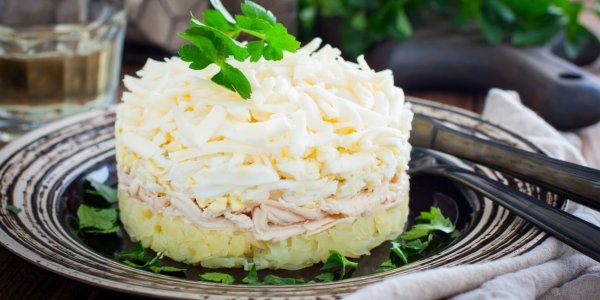 Описание: 🥣 Воздушный салат «Облако»✅ Нужно⇨ Филе куриной грудки – 350 г⇨ Соль – по вкусу⇨ Картофель – 3 шт.⇨ Яйца – 4 шт.⇨ Плавленые сырки – 250 г⇨ Майонез – по вкусу👉 Можно добавить⇨ Зелёный лук – ½ пучка✅ Готовка➦ Отварите филе до готовности и остудите. Разберите на кусочки или нарежьте ножом.❗ Вместо варёной курицы можно взять копчёную — с ней вкус у салата будет намного ярче.➦ Картошку и яйца тоже отварите, остудите и очистите.➦ По отдельности натрите картофель, яйца и сыр на крупной тёрке.❗ Чтобы легче натереть сыр, слегка подморозьте его.➦ Выложите слоями картошку, курицу, яйца и сыр. Все слои, кроме последнего, подсаливайте и промазывайте майонезом. В салат «Облако» часто добавляют зелёный лук — его кладите после мяса.❗ Чтобы салат выглядел аккуратнее, выкладывайте его с помощью кулинарного кольца.