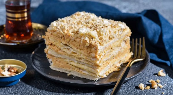 Описание: 🥣 «Наполеон» с варёной сгущёнкой✅ Нужно⇨ Тесто слоёное бездрожжевое – 1 кг⇨ Масло сливочное – 250 г⇨ Молоко сгущённое варёное – 400 г⇨ Грецкий орех – 100 г✅ Готовка➦ Достаньте слоёное тесто из морозильной камеры заранее и, следуя инструкции на упаковке, полностью разморозьте его. Духовку разогрейте до 200 °C. Противни застелите бумагой для выпечки.➦ Если слоёное тесто в прямоугольных пластах, то разрежьте каждый на 2 или 3 части. Ваша цель — получить 6-8 заготовок для коржей из двух упаковок теста. ➦ Аккуратно переложите заготовки на противни и в нескольких местах проколите вилкой по всей поверхности, чтобы тесто не вздувалось пузырями. Выпекайте коржи по 10-15 минут до равномерного золотистого цвета.➦ Готовые коржи должны быть красивыми, румяными и полностью пропечёнными. Достаньте их из духовки и дайте полностью остыть прямо на решётке. Они станут более хрустящими. Самый неровный и некрасивый корж отложите в сторону — он пойдёт на крошку для обсыпки торта.➦ Для крема сливочное масло достаньте из холодильника заранее, чтобы оно стало мягким и пластичным. Переложите масло в глубокую миску и взбивайте миксером на средней скорости 2-3 минуты, пока оно не станет белым и пышным. Не прекращая взбивать, добавляйте варёную сгущенку по столовой ложке, тщательно соединяя её с маслом после каждой порции.➦ На большое сервировочное блюдо или поднос выложите первый корж. Нанесите на него порцию крема (примерно 3 ст.л.) и равномерно распределите лопаткой или ножом. Накройте следующим коржом и повторите процедуру. Таким образом соберите весь торт, обильно промазывая кремом каждый слой.➦ Готовый торт обильно смажьте оставшимся кремом сверху и по бокам. Не стремитесь к идеальной гладкости — лёгкая небрежность придаёт торту особый шарм. Уберите торт в холодильник на 20-30 минут, чтобы крем слегка схватился, это упростит следующий шаг.➦ Пока торт охлаждается, подготовьте крошку. Неровный корж, который вы отложили, поломайте на куски и измельчите в блендере или прокатайте скалкой в пакете. Грецкие орехи также измельчите в мелкую крошку и смешайте с крошкой от коржа. Достаньте торт из холодильника и щедро обсыпьте его со всех сторон приготовленной смесью, слегка прижимая её к крему.➦ Готовому торту «Наполеон» с варёной сгущёнкой дайте хорошо пропитаться в холодильнике, минимум 6-8 часов. За это время коржи смягчатся, впитав в себя крем. Подавайте торт охлаждённым, нарезав на порции острым ножом.❗ НА ЗАМЕТКУ. Не используйте варёную сгущёнку для прослойки в «чистом виде»: она имеет плотную, тягучую консистенцию, коржи просто напросто не пропитаются, и сгущёнка так и останется плотным слоем между ними, получится приторно-сладко. Правильное решение — сделать именно крем, взбив варёную сгущенку со сливочным маслом — идеальным стабилизатором и «разбавителем». ❗ КСТАТИ. При сборке торта в один из слоёв вместе с кремом для «Наполеона» с варёной сгущёнкой можно добавить мелко нарезанные жареные орехи, например, фундук или миндаль.