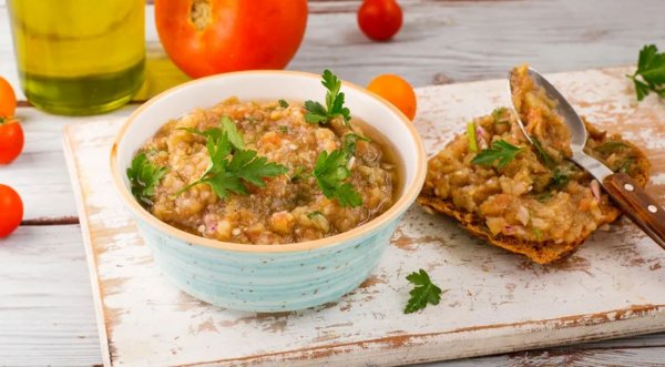 Описание: 🥣 Баклажанная икра простая✅ Нужно⇨ баклажаны – 3 шт.⇨ растительное масло – 4 ст. л.⇨ помидоры – 3 шт.⇨ крупная красная луковица – 1 шт.⇨ укроп – 2 веточки⇨ петрушка – 2 веточки⇨ соль, молотый чёрный перец – по вкусу✅ Готовка➦ Подготовьте ингредиенты для приготовления простой баклажанной икры. Духовку нагрейте до 180 °C. Баклажаны вымойте и хорошо обсушите. Смажьте 2 ст. л. растительного масла.➦ Выложите баклажаны на противень и запекайте около 15 минут (кожица на плодах должна лопнуть). Дайте немного остыть, затем ложкой извлеките из них мякоть. Выложите её в миску.➦ Помидоры для баклажанной икры надрежьте крест-накрест, затем сложите в дуршлаг и несколько раз обдайте кипящей водой, затем — холодной. Очистите плоды от кожицы, мякоть мелко нарежьте.➦ Лук очистите, мелко нарежьте и обдайте кипящей водой. Добавьте в миску с мякотью баклажанов вместе с помидорами. Разомните толкушкой или измельчите погружным блендером.➦ Добавьте оставшееся масло, посолите и поперчите по вкусу. Тщательно перемешайте. Уберите в холодильник до подачи. Листочки зелени нарежьте и украсьте баклажанную икру.❗ КСТАТИ. Если вы хотите заготовить баклажанную икру на зиму, переложите готовую массу в кастрюлю и тушите на слабом огне 20 минут. Затем распределите по подготовленным банкам, простерилизуйте 10 минут и уже затем закатывайте.