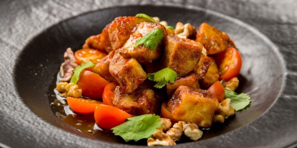 Описание: 🥣 Хрустящие баклажаны в кисло-сладком соусе✅ Нужно (на 2 порции)⇨ Крупный баклажан – 1 шт.⇨ Соль – по вкусу⇨ Помидоры черри – 150 г⇨ Грецкие орехи – 40 г⇨ Кинза или другая зелень – несколько веточек⇨ Чеснок – 1 зубчик⇨ Соевый соус – 3 ст. л.⇨ Сок лимона или лайма – 1 ст. л.⇨ Мёд – 1½ ст. л.⇨ Растительное масло – по вкусу⇨ Кукурузный крахмал – 3 ст. л.👉 Можно добавить:⇨ Хлопья красного перца – по вкусу✅ Готовка➦ Баклажан очистите и нарежьте не слишком крупными кусочками. Посыпьте солью, перемешайте и оставьте на 15 минут.➦ Черри нарежьте половинками или четвертинками. Орехи измельчите ножом. Зелень нарубите. Чеснок пропустите через пресс.➦ Для заправки смешайте соевый соус с чесноком, цитрусовым соком, мёдом и 2 столовыми ложками масла. Добавьте немного хлопьев красного перца, если хотите. Попробуйте соус и сбалансируйте на свой вкус, если нужно.➦ Ополосните кусочки баклажана под прохладной водой и слегка подсушите бумажными полотенцами. Обваляйте в крахмале и стряхните излишки.➦ В глубокой сковороде или сотейнике разогрейте масло на среднем огне. Партиями обжаривайте кусочки баклажана до румяности примерно по 3 минуты и выкладывайте на бумажные полотенца. ❗ Масла должно быть достаточно, чтобы обжарить баклажаны во фритюре.➦ Смешайте горячие кусочки баклажана с черри и соусом. Добавьте зелень с орехами и сразу же подавайте к столу.