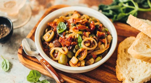 Описание: 🥣 Капоната✅ Нужно⇨ крупные баклажаны – 4 шт.⇨ лук – 2 шт.⇨ вяленые помидоры – 6-8 шт.⇨ крупный помидор – 2 шт.⇨ оливки без косточек – 100 г⇨ солёные каперсы – 50 г⇨ черешок сельдерея – 2 шт.⇨ сахарный песок – 1/2 ст. л.⇨ оливковое масло «экстра вирджин»⇨ соль✅ Готовка➦ Баклажаны нарежьте, посолите, положите в дуршлаг под тарелку с грузом. Оставьте на 5-10 мин. Помидоры бланшируйте, лук нарежьте кольцами, сельдерей – кубиками. Вяленые помидоры измельчите.➦ Обжарьте лук в 2 ст. л. масла на среднем огне до мягкости, 5 мин. Добавьте все помидоры, готовьте 5 мин. Всыпьте сельдерей, готовьте ещё 3–4 мин. Затем добавьте оливки и каперсы. Готовьте на слабом огне 10 мин.➦ Баклажаны обсушите, обжарьте в отдельной сковороде. Положите баклажаны в одну сковороду с овощами, готовьте ещё 10 мин. Добавьте сахар и уксус. Подавайте капонату тёплой или холодной.
