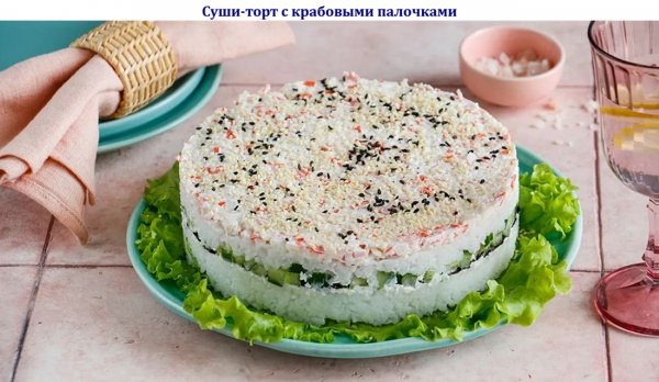 Описание: 🥣 Суши-торт с крабовыми палочками✅ Нужно⇨ Рис круглозёрный шлифованный – 250 г⇨ Крабовые палочки – 250 г⇨ Огурец – 200 г⇨ Сыр сливочный – 200 г⇨ Уксус рисовый – 100 мл⇨ Кунжут – 50 г⇨ Нори лист – 1 шт.⇨ Салатные листья – 2 шт.⇨ Сахар-песок – 1 ст.л.⇨ Соль – по вкусу✅ Готовка➦ Подготовьте ингредиенты. Прежде всего, сварите рис. Промывать его ни в коем случае не надо, так как на поверхности зёрнышек много крахмала, клейкость которого необходима в данном случае.➦ Насыпьте рис в кастрюлю с толстым дном (ёмкостью 1,5 литра). Залейте 1 л питьевой воды. Немного посолите. Поставьте на средний огонь. Когда вода закипит, убавьте его до слабого.➦ Варите рис примерно двадцать минут под крышкой. Затем выключите конфорку. Оставьте рис под крышкой ещё на 15 минут. Можно прикрыть кастрюлю толстым кухонным полотенцем. Переложите рис на большую плоскую тарелку, чтобы он быстрее остыл.➦ Соедините в миске сахар и чайную ложку соли. Залейте рисовым уксусом. Перемешайте, чтобы сахар и соль растворились. Получившейся смесью залейте остывший рис и хорошо перемешайте.➦ Достаньте крабовые палочки из упаковки. Снимите с каждой целлофановую оболочку. Мелко нарежьте палочки. Огурцы нарежьте кубиками среднего размера. Если кожица грубая, а семена крупные, удалите и то, и другое.➦ Обжарьте кунжут на сковороде без масла. Дайте остыть. Возьмите лист нори и вырежьте из него круг по размеру кулинарного кольца (20-22 см диаметром). Листья салата вымойте и очень хорошо обсушите.➦ Уложите салатные листья на большую плоскую тарелку. Поставьте на неё то самое кулинарное кольцо. Выложите внутрь слой риса с уксусом слоем 1,5-2 см. Утрамбуйте ладонью. ➦ Смажьте рис небольшим количеством сливочного сыра. Посыпьте кунжутом (столовой ложки будет достаточно). Накройте листом нори. Сверху распределите огурцы. Уложите оставшийся рис. Утрамбуйте.➦ Перемешайте крабовые палочки с оставшимся сливочным сыром. Выложите на рис, разровняйте. Затяните верх пищевой плёнкой, уберите в холодильник на 1 час. Перед подачей посыпьте оставшимся кунжутом.❗ КСТАТИ. Суши-торт с крабовыми палочками можно приготовить накануне подачи: он вполне может провести ночь в холодильнике. Качество блюда от этого не только не пострадает, но даже выиграет, так как вкус станет насыщеннее, а текстура — плотнее.❗ НА ЗАМЕТКУ. Если хотите, лист нори для суши-торта с крабовыми палочками можно использовать не целиком, а порвать на небольшие кусочки и в таком виде выложить на слой риса со сливочным сыром.