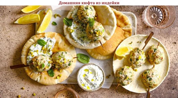 Описание: 🥣 Домашняя кюфта из индейки✅ Нужно (на 4 порции)⇨ фарш из индейки – 500 г⇨ большой кабачок – 1 шт.⇨ перец красный острый – 1 стручок⇨ фисташки очищенные – 50 г⇨ лук зелёный – 2 побега⇨ кинза – 3 веточки⇨ петрушка – 3 веточки⇨ мята – 3 веточки⇨ тимьян свежий – 5-6 веточек⇨ яйцо куриное – 1 шт.⇨ семена зиры – ¼ ч. л.⇨ соль – ½ ч. л.⇨ пита, соус цацики (дзадзики), мята и лимон – для подачи✅ Готовка➦ Кабачок натрите на тёрке, перец, зелёный лук и пряные травы мелко нарежьте, фисташки крупно порубите.➦ Зиру подсушите на сухой сковороде.➦ Слегка взбейте яйцо. Смешайте в большой миске фарш, яйцо, кабачок, перец, травы и большую часть фисташек (оставьте немного для украшения). Приправьте солью и семенами зиры.➦ Смоченными в холодной воде руками сформируйте из фарша шарики размером с куриное яйцо. Разложите на поднос и уберите в холодильник минимум на 30 мин. Насадите на шпажки по 2 шарика.➦ Разогрейте духовку до 180 °С. Подготовьте противень с решёткой, смажьте решётку маслом, разложите шпажки и готовьте 15 мин., до готовности.➦ Переложите кюфту на подогретые питы, добавьте соус цацики и посыпьте фисташками и мятой. Подавайте с лимоном.❗ НА ЗАМЕТКУ. Домашнюю кюфту можно приготовить и из говядины или баранины, а вместо фисташек использовать поджаренные кедровые орехи.❗ КСТАТИ. Чтобы кюфта получилась более плотной, фарш можно хорошо вымесить в стационарном миксере с насадкой-крюком в течение 10 минут или отбить об стенку миски.