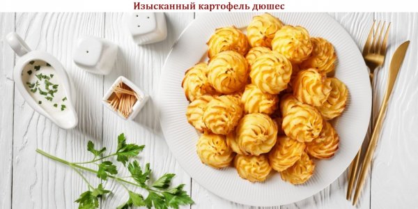 Описание: 🥣 Изысканный картофель дюшес✅ Нужно (на 4 порции)⇨ Картошка – 750 г⇨ Сливочное масло – 2-3 ст. л.⇨ Куриные желтки – 4 шт.⇨ Соль – по вкусу⇨ Перец белый молотый – по вкусу⇨ Мускатный орех – по вкусу⇨ Растительное масло – 1 ч. л.⇨ Вода – 1 ст. ложка✅ Готовка➦ Картошку очистите и отварите до мягкости примерно за 20-30 минут. Слейте всю жидкость.➦ Разомните горячую картошку толкушкой и сразу же взбейте погружным блендером или протрите через мелкое сито, чтобы не осталось крупных кусочков.➦ Добавьте растопленное сливочное масло, 2 желтка, соль, перец и мускатный орех. Перемешайте.➦ Противень смажьте растительным маслом и через кулинарный мешок выложите на него порции пюре.➦ Оставшиеся желтки взбейте с водой и смажьте ими картошку.➦ Запекайте примерно 20 минут при температуре 200 °С.
