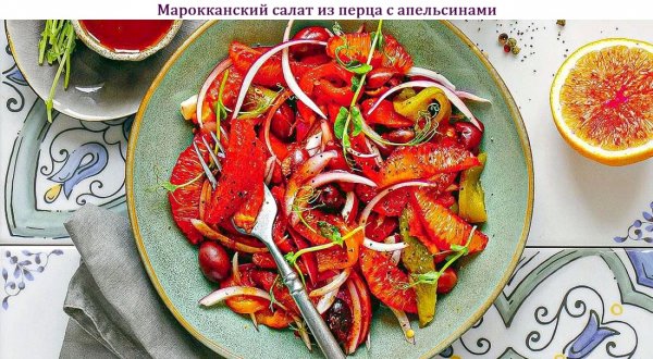 Описание: 🥣 Марокканский салат из перца с апельсинами✅ Нужно (на 4 порции)⇨ перцы сладкие крупные – 4 шт.⇨ апельсины красные – 3 шт.⇨ маслины типа каламата с косточкой – 200 г⇨ луковица красная сладкая – 1 шт.⇨ сок половины лимона⇨ оливковое масло – 2 ст. л.⇨ зира молотая – 0,5 ч. л.⇨ паприка сладкая молотая – 0,5 ч. л.⇨ соль⇨ зелень для украшения✅ Готовка◆ – Поместите перцы на листе пергамента на противень под разогретый до 220-240 °С гриль. Поворачивайте, пока кожица со всех сторон не станет чёрной.◆ – Положите перцы в миску, закройте, оставьте на 10 минут. Затем очистите. Нарежьте мякоть полосками.◆ – Раздавите маслины плоскостью лезвия ножа, освободите от косточек. Лук очистите и нарежьте перьями.◆ – С апельсинов снимите мелкой тёркой цедру, срежьте кожуру вместе с белой частью, чтобы стало видно мякоть. Вырежьте из апельсинов филе по долькам между плёнками. Смешайте с перцами, маслинами и луком.◆ – Сделайте заправку из смеси лимонного сока, масла, цедры, соли, зиры и паприки, полейте салат. Украсьте зеленью и подавайте.❗ НА ЗАМЕТКУ. Салат с апельсинами, перцем и маслинами прекрасно подойдёт в качестве гарнира к мясным блюдам, Его можно также подать как самостоятельную закуску, сопроводив тёплыми лепёшками для большей сытости.❗ КСТАТИ. В приготовлении салата вместо маслин можно использовать каперсы. А сладкий перец берите любой, лучше разноцветный - зелёный, жёлтый, красный - для контраста. По желанию в марокканский салат можно добавить ещё немного специй, например, молотого кориандра или чёрного перца