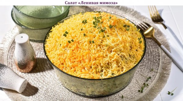 Описание: 🥣 Салат «Ленивая мимоза»✅ Нужно (на 4 порции)⇨ Горбуша в собственном соку – 220 г⇨ Яйцо куриное – 4 шт.⇨ Сыр полутвёрдый – 150 г⇨ Лук зелёный – 50 г⇨ Майонез – 80 г⇨ Горчица зернистая – 1 ч.л.⇨ Укроп – 30 г⇨ Перец чёрный молотый – по вкусу✅ Готовка◆ – Сварите куриные яйца вкрутую без особых ухищрений, в течение 9-10 минут. Даже если они лопнут — ничего страшного. Переложите яйца в холодную воду, дайте им остыть.◆ – Пока яйца варятся, сделайте всё остальное. Выньте из банки горбушу. Не поленитесь удалить косточки, даже если они мягкие. Измельчите филе вилкой, не превращая его в кашу — пусть останутся кусочки ощутимой величины. Положите в миску.◆ – Зелёный лук вымойте и обсушите салфетками. Так же поступите с укропом. Лук мелко нашинкуйте вместе с белыми частями. У укропа нарежьте только лиственную часть без стебельков. Добавьте весь лук и половину укропа в миску к рыбе.◆ – Полутвёрдый сыр натрите на мелкой тёрке, положите в миску к остальным ингредиентам. Очистите остывшие яйца, разделите на белки и желтки. Натрите белки на крупной тёрке в миску со всем остальным.◆ – Смешайте майонез с зернистой горчицей и небольшим количеством сока из-под горбуши. Добавьте получившийся соус в салат, хорошо перемешайте, приправьте молотым черным перцем по вкусу.◆ – Переложите «Ленивую мимозу» в салатник или на сервировочную тарелку горкой. Натрите яичные желтки на мелкой тёрке и равномерно посыпьте ими горку салата. Также посыпьте «Ленивую мимозу» отложенным рубленым укропом. И подавайте без церемоний.❗ НА ЗАМЕТКУ. Если вы хотите сделать «Ленивую мимозу» с картофелем и морковью, то придётся мелко резать их ножом, а не тереть, поскольку в тёртом виде эти ингредиенты смешаются в непрезентабельную массу. Но если всё резать, то в итоге получится какое-то рыбное подобие оливье без горошка и огурцов. Но вы же не этого хотели?❗ КСТАТИ. «Ленивую мимозу» можно также сделать не с полутвёрдым сыром, а с плавленым. Тогда салат будет напоминать знаменитую «Белочку» без чеснока, но с луком и консервированной рыбой. Очень вкусно, между прочим. Хоть на хлеб намазывай.
