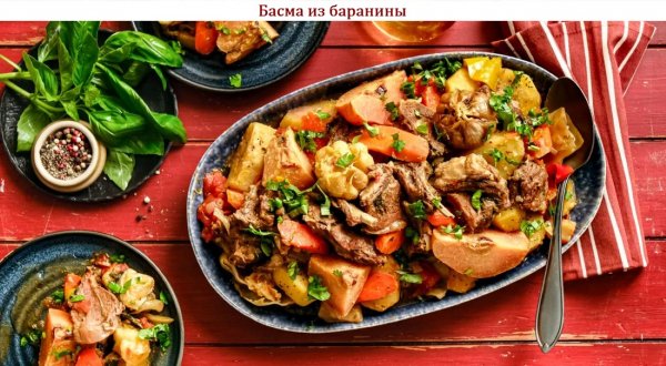 Описание: 🥣 Басма из баранины✅ Нужно⇨ Баранина на кости – 1 кг⇨ Курдючный жир – 150 г⇨ Картофель – 800 г⇨ Перец сладкий красный – 700 г⇨ Томат (помидор) – 700 г⇨ Капуста белокочанная – 600 г⇨ Лук репчатый – 500 г⇨ Морковь – 300 г⇨ Айва – 2 шт.⇨ Чеснок – 2 шт.⇨ Кинза – 25 г⇨ Петрушка – 25 г⇨ Укроп – 25 г⇨ Базилик свежий – 25 г⇨ Лавровый лист – 1 шт.⇨ Зира – 2 ч.л.⇨ Кориандр семена – 2 ч.л.⇨ Паприка сушёная – 2 ч.л.⇨ Барбарис сушёный – 2 ч.л.⇨ Перец красный молотый – 1 ч.л.⇨ Соль – 4 ч.л.✅ Готовка◆ – Для удобства смешайте все сухие специи — семена зиры и кориандра, паприку, острый перец и барбарис с солью. При желании можете сначала растереть зиру, кориандр и барбарис в ступке пестиком.◆ – Баранину с косточками нарежьте кусками средней величины. Курдючный жир — ломтиками толщиной 5-7 мм. Выложите дно холодного казана ломтиками курдюка. На него — куски баранины. Посыпьте 2 ч. л. специй. Положите на мясо по паре веточек петрушки, базилика, укропа и кинзы.◆ – Очистите репчатый лук, нарежьте полукольцами. Распределите лук поверх мяса с зеленью. Помидоры ошпарьте кипятком, затем обдайте холодной водой, снимите кожицу и нарежьте мякоть кружками.◆ – Распределите кружочки помидоров поверх лука. Присыпьте ещё двумя чайными ложками смеси специй с солью. Вымойте и очистите морковь. Нарежьте наискосок ломтиками толщиной 7-8 мм, уложите на помидоры.◆ – Вымойте и очистите картофель, разрежьте на 2-4 части, в зависимости от размера, уложите поверх моркови. Посыпьте морковь и картофель ещё двумя чайными ложками пряной смеси.◆ – С головок чеснока снимите верхние слои шелухи, оставив только последний слой, который держит головку цельной. Срежьте нижнюю часть с корешками. Положите чеснок между картофелинами.◆ – Айву вымойте, хорошо оботрите, чтобы снять пушок и тоже целиком положите в казан. Сладкий перец очистите от семян и перегородок и нарежьте короткой соломкой. Разложите поверх картошки и вокруг айвы.◆ – С капусты снимите и отложите 5-6 верхних листьев. Остальную капусту крупно нарежьте, удалив жёсткие фрагменты. Выложите верхним слоем. Присыпьте содержимое казана оставшейся смесью специй, добавьте лавровый лист.◆ – Пучки зелени промойте и обсушите полотенцами. Кинзу можно оставить с корешками, главное — хорошо промыть. Разложите зелень на капусту. Сверху всё накройте капустными листьями.◆ – Прижимая руками сверху содержимое казана, постарайтесь его уплотнить. Если оно выпирает, ничего страшного — осядет в процессе тушения. На капусту положите большую керамическую тарелку и ещё раз слегка прижмите.◆ – Закройте казан крышкой и поставьте на сильный огонь. Неплохо ещё придавить крышку грузом, если она закрылась не до конца. Минут через 10 вы услышите шкворчание — это топится жир. Ещё через 10 минут услышите звук кипения. Уменьшите огонь до минимума и томите басму 2 часа.P.S. Продолжение в комментариях