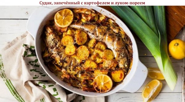 Описание: 🥣 Судак, запечённый с картофелем и луком-пореем✅ Нужно⇨ 2 потрошёных судака весом около 600 г⇨ 6 маленьких картофелин⇨ половина стебля лука-порея (белая и светло-зелёная части)⇨ 1 лимон⇨ 2 веточки петрушки⇨ 5 веточек тимьяна⇨ 3 ст. л. сливочного масла⇨ 2-3 ст. л. тёртого сыра пармезан⇨ 3 ст. л. сливок жирностью 33%⇨ 1 ч. л. сахара⇨ соль, молотый чёрный перец✅ Готовка◆ – Разогрейте духовку до 200 °С. Помойте картофель щёткой, нарежьте кружками толщиной 1 см и положите в кастрюлю. Залейте кипящей водой, посолите и варите, пока картофель не станет слегка мягким, 5-7 минут.◆ – Сделайте на рыбе косые надрезы, посолите и поперчите, в брюшко положите петрушку. Смажьте кожу 1 ст. л. сливочного масла и поместите рыбу в большую форму для запекания.◆ – Слейте воду с картофеля, смешайте картофель с оставшимся маслом. Переложите к рыбе и посыпьте пармезаном.◆ – Лук-порей промойте от песка, нарежьте кольцами. Смешайте порей со сливками, посолите.◆ – Выложите лук-порей со сливками на рыбу. Рядом положите половинки лимона и посыпьте сахаром. Разложите веточки тимьяна.◆ – Поставьте блюдо в духовку и запекайте 20-25 минут, до готовности рыбы и картофеля.❗ НА ЗАМЕТКУ. Рыба с картошкой – настоящая домашняя еда, простая и очень вкусная. Не нужно придумывать сложных блюд, судак относится к благородным сортам рыбы, нужно бережно относиться к его вкусу. Достаточно запечь рыбу с картошкой в духовке, на это нужно совсем немного времени.