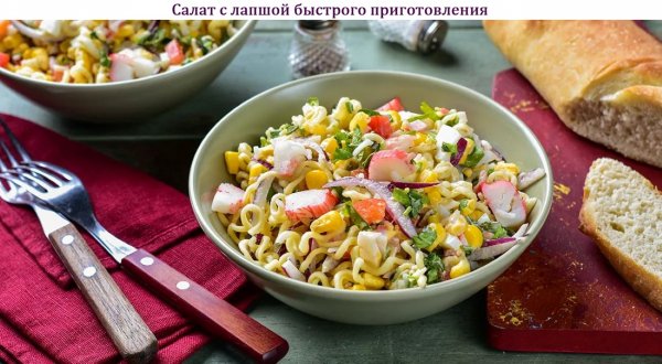 Описание: 🥣 Салат с лапшой быстрого приготовления✅ Нужно⇨ Лапша быстрого приготовления – 60 г⇨ Яйцо куриное – 2 шт.⇨ Крабовые палочки – 150 г⇨ Перец сладкий красный – 120 г⇨ Кукуруза сладкая консервированная – 100 г⇨ Лук крымский красный – 70 г⇨ Кинза – 15 г⇨ Соус соевый – 1 ст.л.⇨ Майонез – 100 г⇨ Перец чёрный молотый – по вкусу⇨ Соль – по вкусу✅ Готовка◆ – Изучите инструкцию на упаковке лапши быстрого приготовления. Поломайте брикетик лапши на небольшие кусочки и переложите их с приправами или без в миску.◆ – Заварите лапшу кипятком в количестве, указанном на упаковке. По истечении необходимого времени — обычно оно составляет 3-5 минут — откиньте лапшу на дуршлаг и дайте ей остыть.◆ – Отварите яйца вкрутую в течение 8-10 минут. Переложите их в холодную воду, дайте остыть. Затем очистите от скорлупы и нарежьте маленькими кубиками. Можно воспользоваться яйцерезкой.◆ – Если крабовые палочки заморожены, то предварительно разморозьте их при комнатной температуре, а затем нарежьте тонкими круглыми ломтиками или соломкой.◆ – Сладкий перец вымойте, очистите от семян, удалите мягкие части внутренних перегородок. Нарежьте перец маленькими кубиками или тонкой недлинной соломкой.◆ – Красный ялтинский лук нашинкуйте тонкими клинышками. Зелень кинзы хорошо промойте в миске с водой и обсушите салфетками. Мелко порубите часть с листьями. Голые стебельки отбросьте.◆ – Соедините в глубокой миске нарезанные яйца, сладкий перец, лук и кукурузу, добавьте подготовленную лапшу и зелень кинзы, заправьте салат соевым соусом и майонезом по вкусу. Посыпьте молотым чёрным перцем, хорошо перемешайте и попробуйте, прежде чем солить.❗ НА ЗАМЕТКУ. С лапшой быстрого приготовления вы можете приготовить любой салат, в который привыкли добавлять рис. Вместо крабовых палочек можно положить в салат кальмары, колбасу, ветчину, грибы или рыбные консервы. Вместо сладкого перца — свежий огурец.❗ КСТАТИ. Приправы, входящие в комплект с лапшой, вы можете добавлять по своему вкусу — полностью или частично. Например, взять специи и не брать сушёные овощи. Если приправа слишком острая, используйте полпакетика.