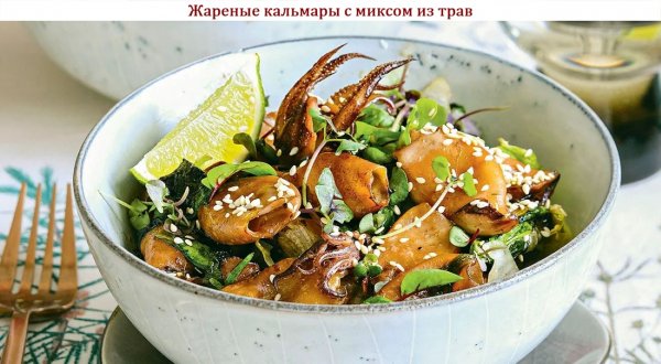 Описание: 🥣 Жареные кальмары с миксом из трав✅ Нужно (на 4 порции)⇨ Кальмары свежие – 360 г⇨ Масло сливочное – 60 г⇨ Масло растительное рафинированное– 60 г⇨ Соус соевый – 40 мл⇨ Соус устричный – 20 г⇨ Чеснок – 2 зубчика⇨ Кунжут – 20 г⇨ Соль – по вкусу⇨ Лайм – 1 шт.🔶 Для микса трав:⇨ Шпинат – 160 г⇨ Салат Айсберг – 50 г⇨ Базилик свежий – 16 г⇨ Мята свежая – 10 шт.⇨ Эстрагон (тархун) – 10 г✅ Готовка◆ – Порвите салат Айсберг, шпинат и все травы — всё смешайте.◆ – Очистите и крупно порубите чеснок, смешайте с растительным маслом, солью, соевым соусом. Добавьте в маринад кальмаров и перемешайте.◆ – Раскалите сковороду, добавьте сливочное масло и сразу же выложите кальмаров. Готовьте 1 минуту, слегка уменьшите огонь, добавьте устричный соус и микс трав, перемешайте. Разложите по тарелкам, посыпьте кунжутом и немедленно подавайте с долькой лайма.❗ КСТАТИ. Кунжут чаще всего продают необжаренным, но это легко исправить: разогрейте сковороду без масла на среднем огне и поджарьте кунжут, постоянно помешивая, до золотистого цвета в течение 1-2 минут.❗ НА ЗАМЕТКУ. К миксу трав можно добавить тонко нарезанную свежую спаржу или стручки молодого зелёного горошка для дополнительного хруста и свежести.